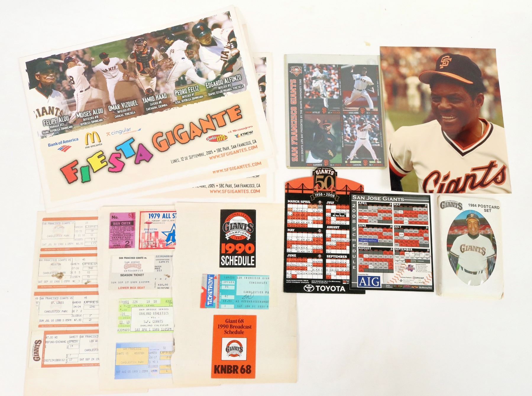 Nice group of ephemera from the San Francisco Giants. There's an unopen pack of Giants' postcards from 1984, magnet schedules for the 2008 Giants and the San Jose Giants (A Farm Club) 2008 schedule. Also included is a score book. with newspaper box scores on each page. There's also a page with admission tickets for both the Giants and the Oakland A's. There are five fan cards from Hispanic Heritage night. To top it off, there's an 8"x 10" color photo of the greatest Giant Willie Mays. It's an interesting group for any Giants' fan. Please see photos for more details.