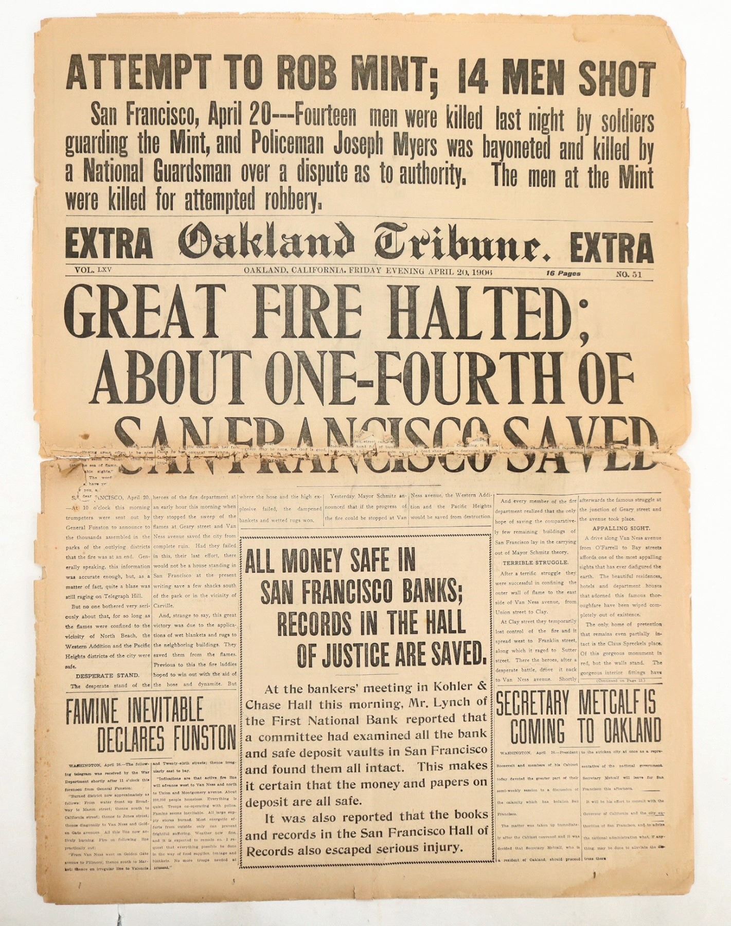 Extra edition of the April 20, 1906 Oakland Tribune: ATTEMPT TO ROB MINT; 14 MEN SHOT / San Francisco, April 20---Fourteen men were killed last night by soldiers guarding the Mint, and Policeman Joseph Myers was bayoneted and killed by a National Guardsman over a dispute as to authority. The men at the Mint were killed for attempted robbery. The next headline: GREAT FIRE HALTED; ABOUT ONE-FOURTH OF SAN FRANCISCO SAVED. Front page is detached mid page, but the whole section is readable.