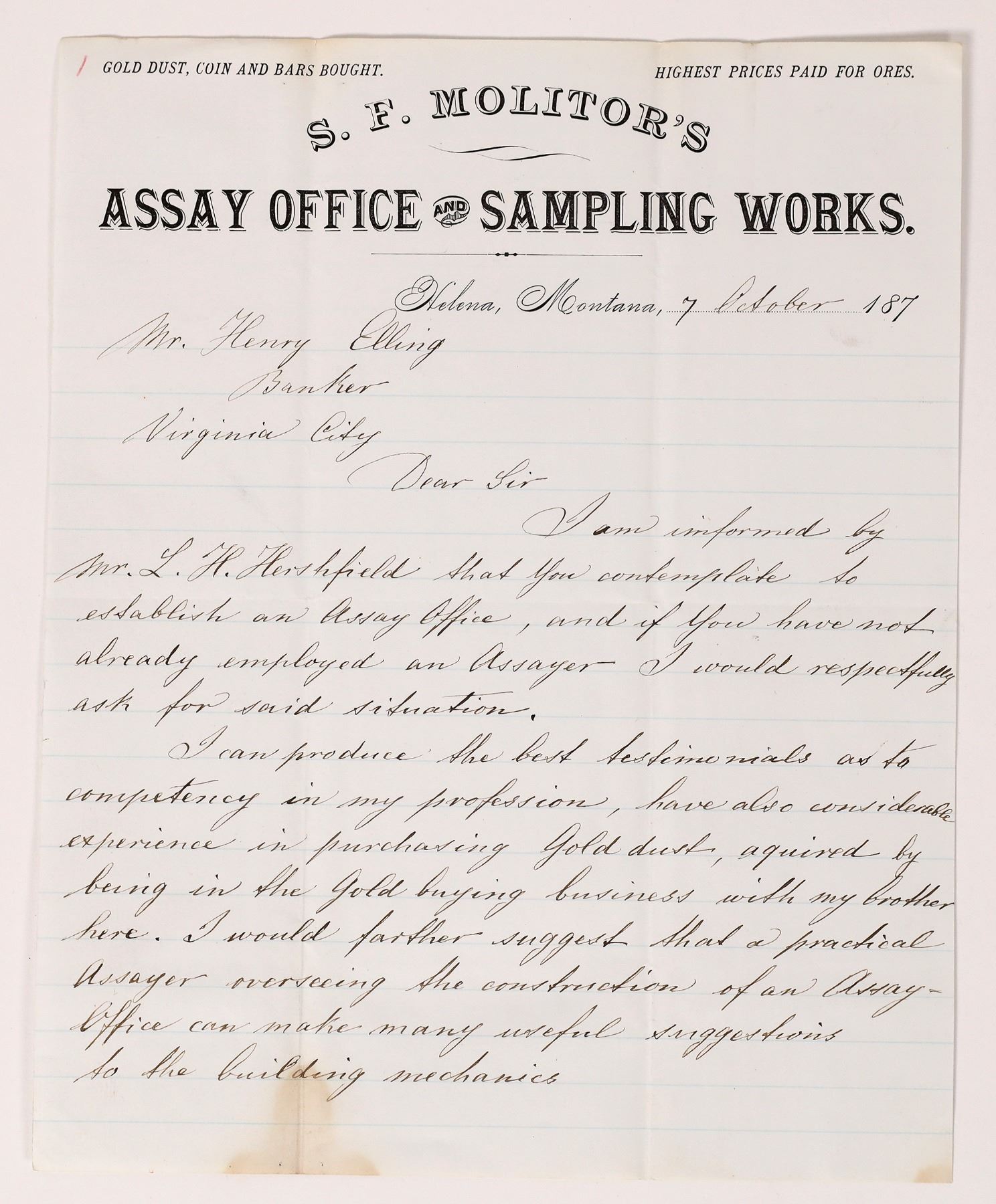 Very rare letter to Henry Elling (later working for the USAO) on a SF Molitor letterhead in 1870's asking for an assayer job. Letter is unsigned and on 1 page, possibly by Molitor and incomplete. Creases and 1.25" lower stain.