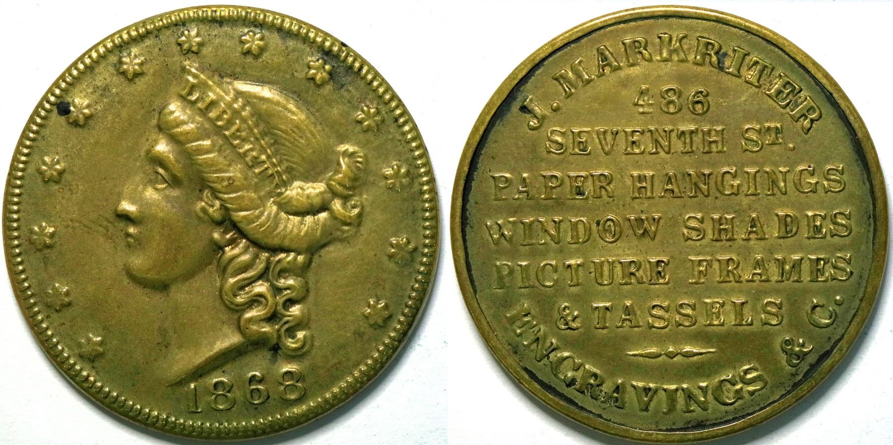 Reverse: J. Markriter/486/Seventh St./Paper Hangings/Window Shades/Picture Frames/& Tassels/Engravings & C./34mm/emb. metal.