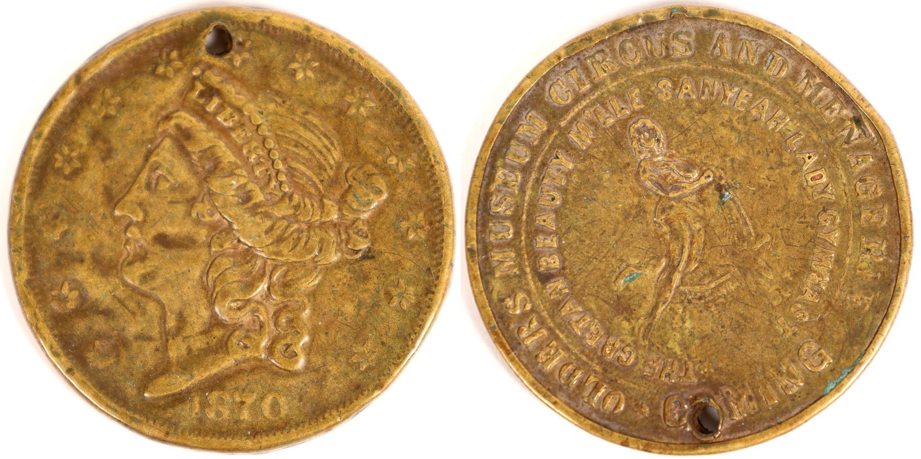 Reverse: Older's Museum Circus & Menagerie/The Cretan Beauty M'lle Sanyeah Lady Gymnast/Coming/sm hole thru bottom like the one pictured in Bower's, pg. 96/34mm