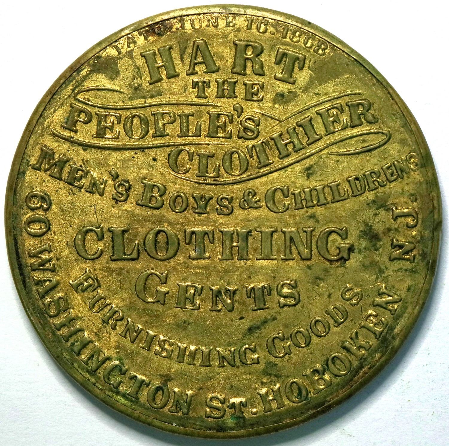 Reverse: Hart/The /People's/Clothier/Men's & Boys & Childrens/Clothing/Gents/Furnishing Goods/60 Washington St. Hoboken, N.J./emb. metal/38mm.