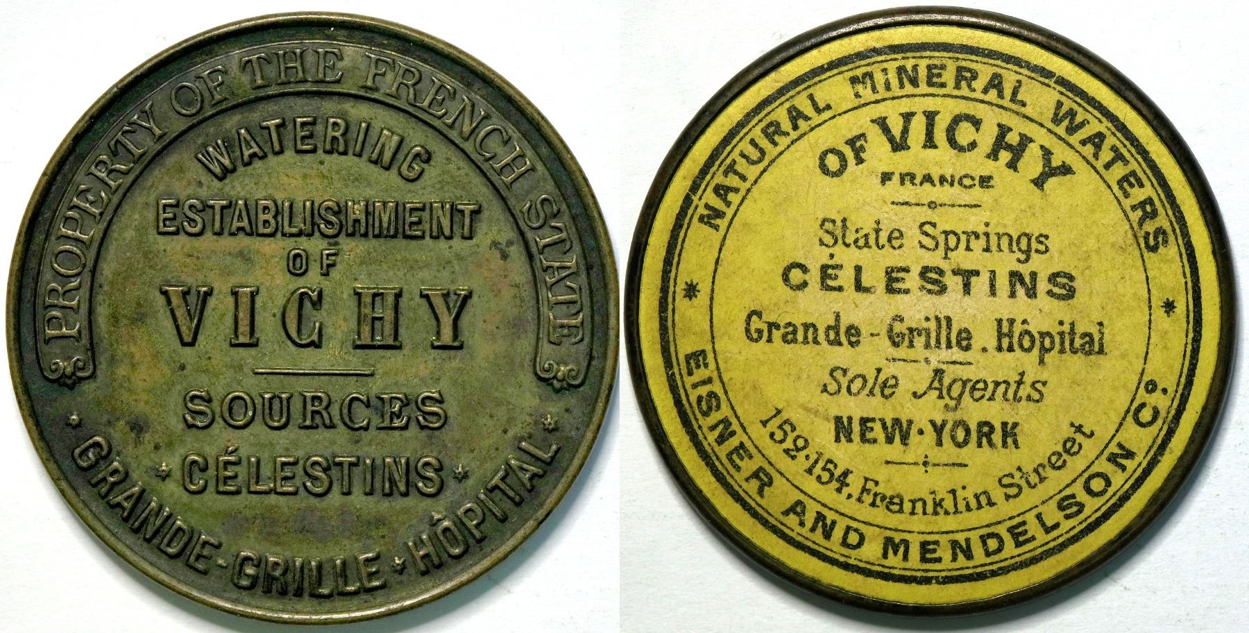 Reverse: Yellow cardboard. Natural Mineral Waters/of Vichy/France/State Springs/Celestins/Grande-Grille. Hopital/Sole Agents/New York/152-154 Franklin Street/Eisner and Mendelson Co./ 39mm