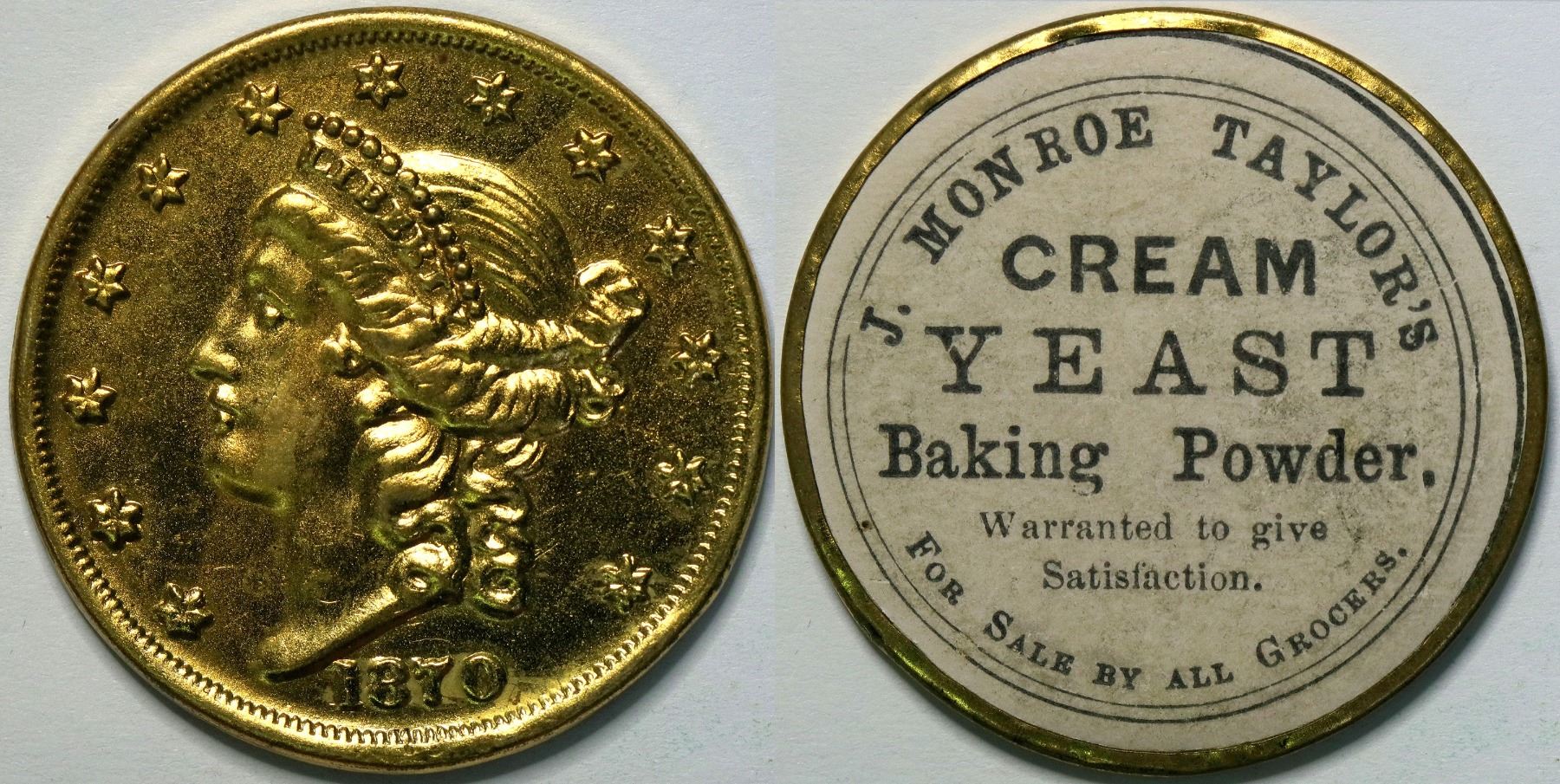 Reverse: J. Monroe Taylor's/Cream/Yeast/Baking Powder./Warranted to give/Satisfaction/For Sale by all Grocers./34mm/light purple cardboard.