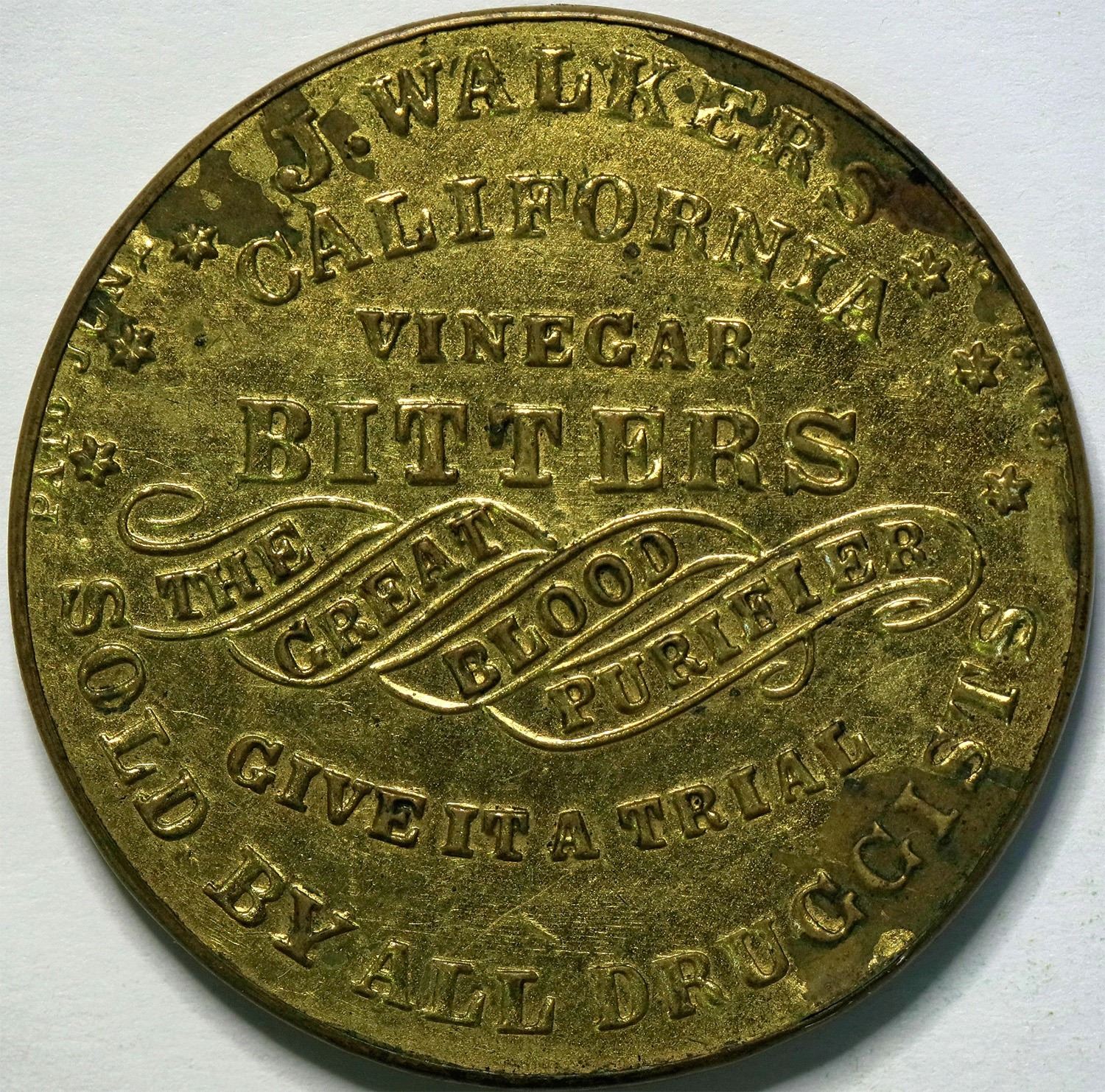 Reverse: J. Walkers/Patd June/ 16 68 (not readable)/California/Vinegar/Bitters/The Great Blood Purifier/Give It A Trial/Sold By All Druggists/emb. mtl/38mm.