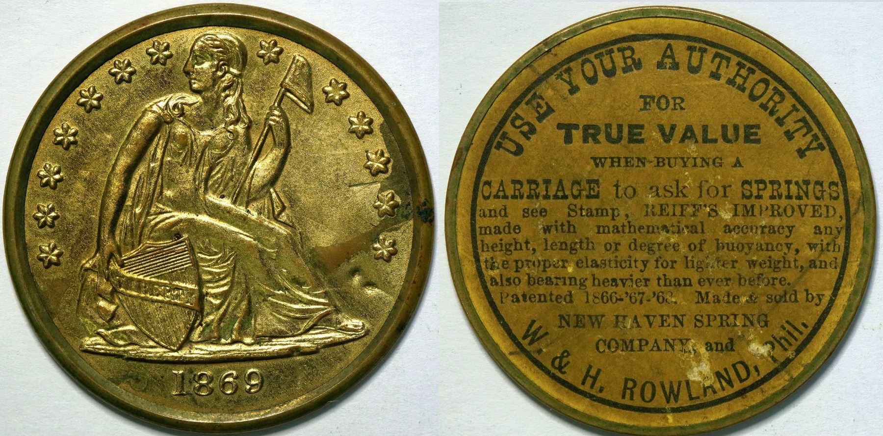 Reverse: W.H. Rowland & New Haven Spring Company/Use Your Authority/For/True Value/When Buying a Carriage/Yellow cardboard/ emb. metal/ 38mm.