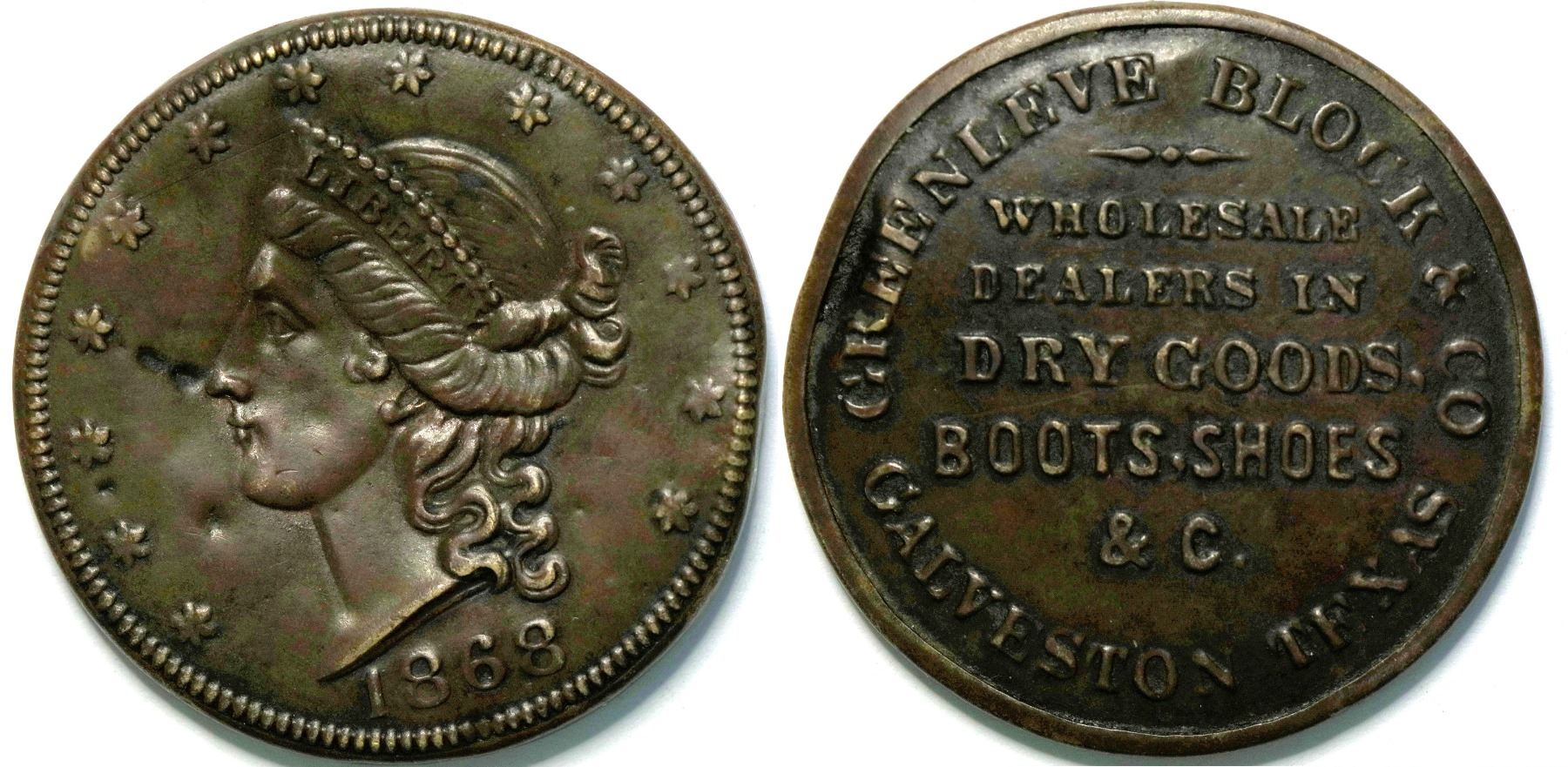 Reverse: Greenlove, Block & Co./Wholesale/Dealers In/Dry Goods/Boots, Shoes/ & C./Galveston, /Texas/ 34 mm