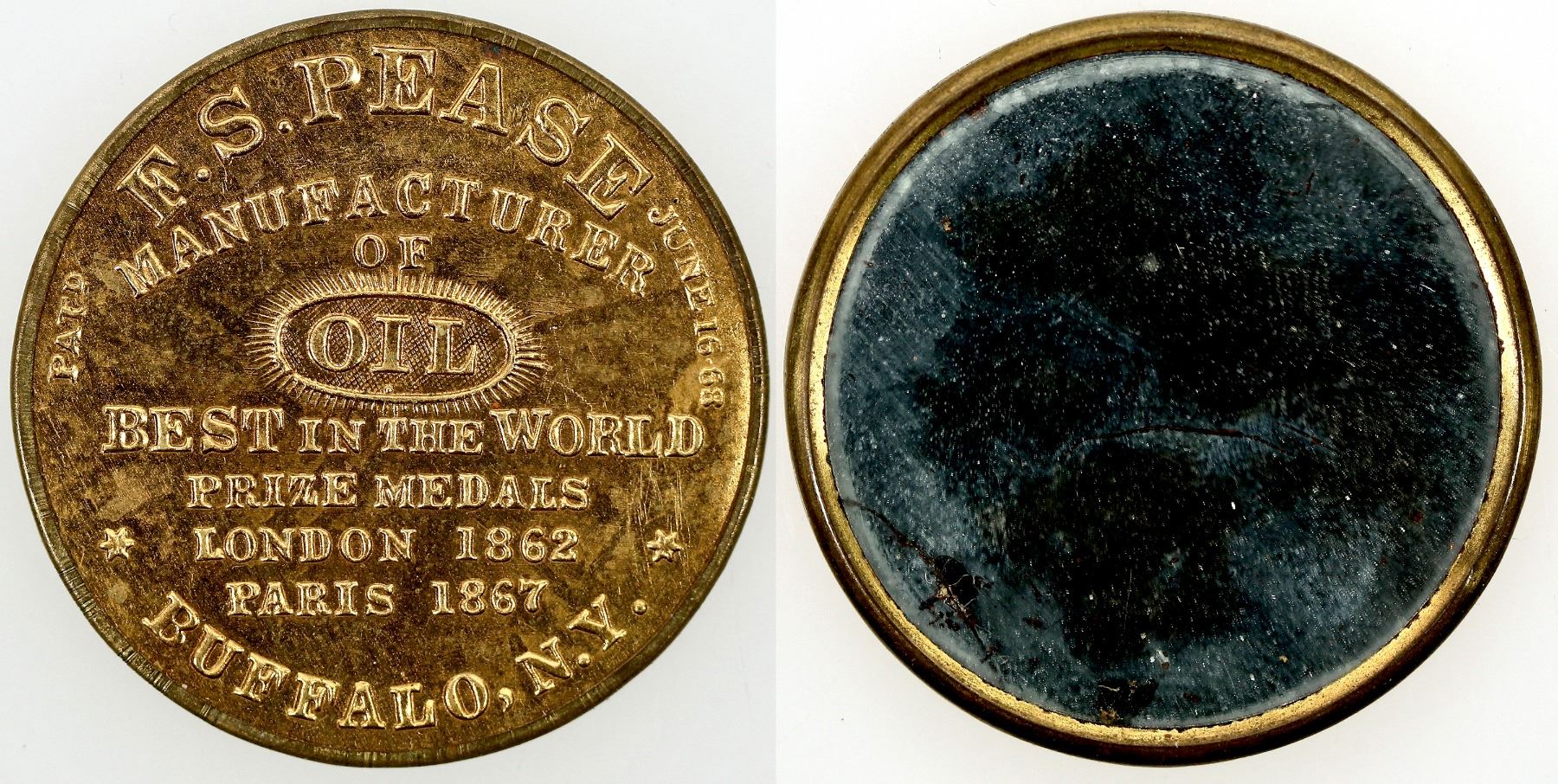 F.S. Pease/ Manufacturers of Oil/ Best in the World/Prize Medals/London 1862/Paris 1867/Buffalo, N.Y.