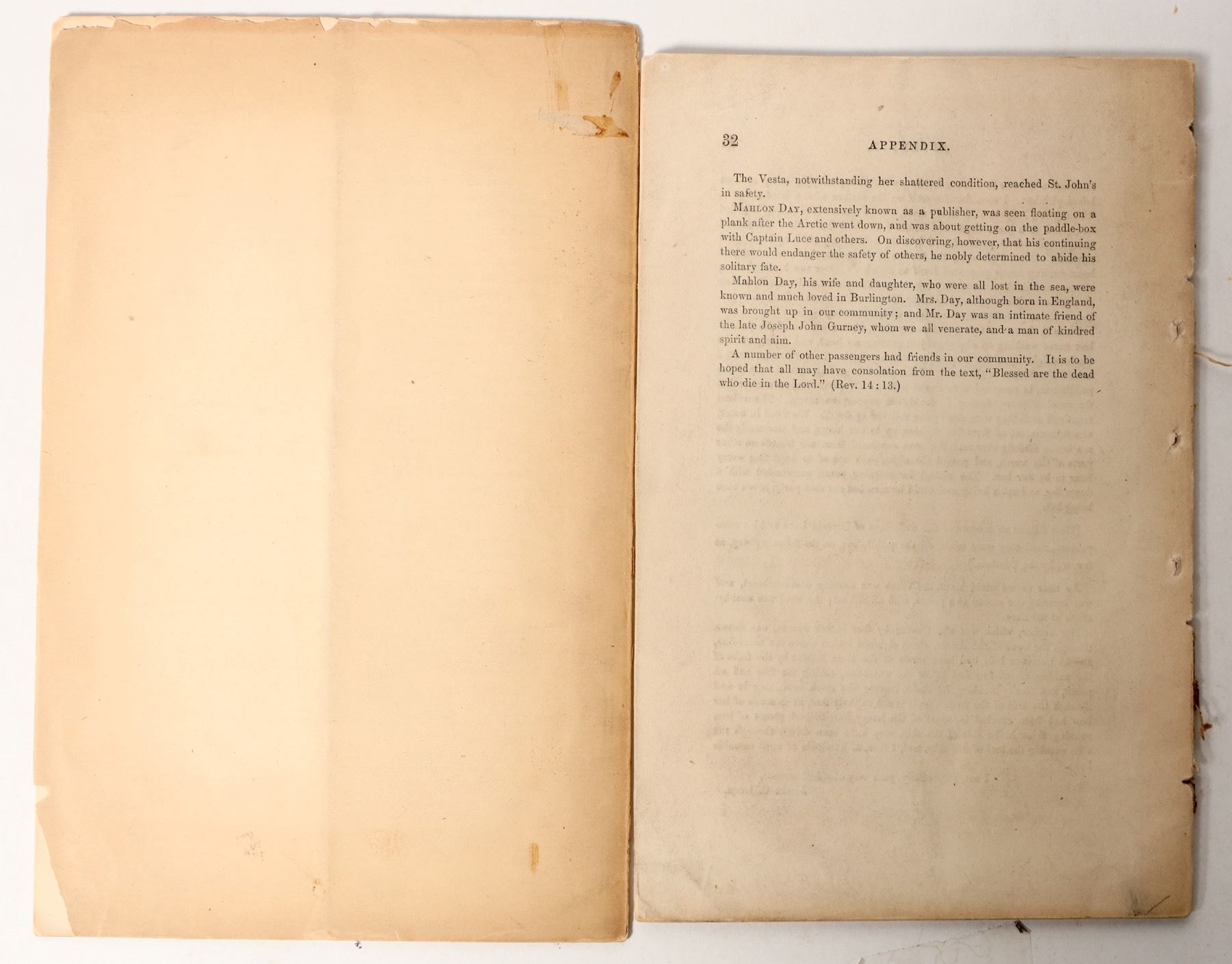 A discourse on the occasion of the wreck of the Arctic, a controversial shipwreck where crew and able bodied men overpowered women and children to win the limited lifeboats. Out of over 400 passengers, there were only 88 survivors. Discourse was delivered in a Presbyterian church in Burlington, New Jersey, 1854. Also included is a report of Dr. Hayes' arctic expedition, seemingly not connected to the shipwreck aside from location. Both pamphlets have binding in delicate condition, with pages in generally good condition aside from light toning and the occasional fold. Both pamphlets are about 5.5x8.5". See photo.
