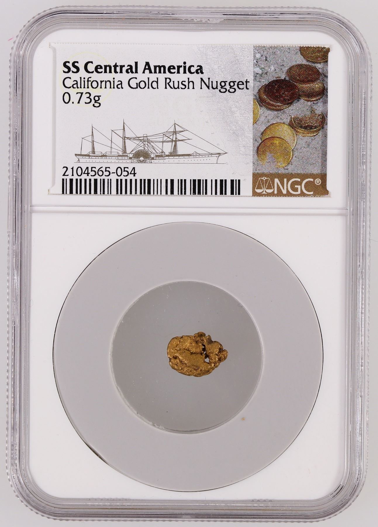 0.73g original California Gold Rush nugget recovered from the SS Central America, which sank in 1857. Our company held two SSCA artifacts auctions in Dec. 2022 and March 2023. This gold nugget is in an NGC holder and comes with a booklet from AMSI. Your chance to own original gold mined in the Gold Rush!