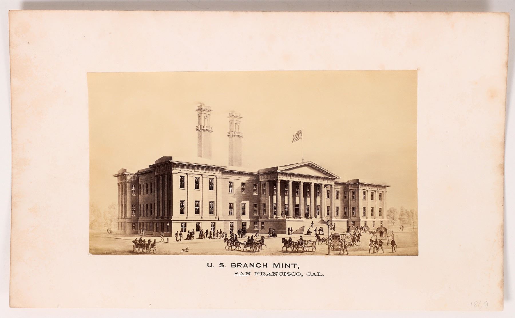 Artistic rendition of the U. S. Branch Mint at San Francisco, "The Old Granite Lady", in the horse and buggy days. 9 x 5 1/2 inch mat, the unattributed drawing is 6 x 3 1/2 inches. In 1867, Mint officials agreed to purchase land at the corner of Fifth and Mission Streets in San Francisco to expand operations. Construction was completed in 1874. Hailed as the "Granite Lady," it got its name for its massive two-story structure built out of granite. The Granite Lady's size, strength and sturdy construction proved itself when it survived the Great San Francisco Earthquake on April 18, 1906. (written in pencil front and back is "1869"). San Francisco California Franklin Collection