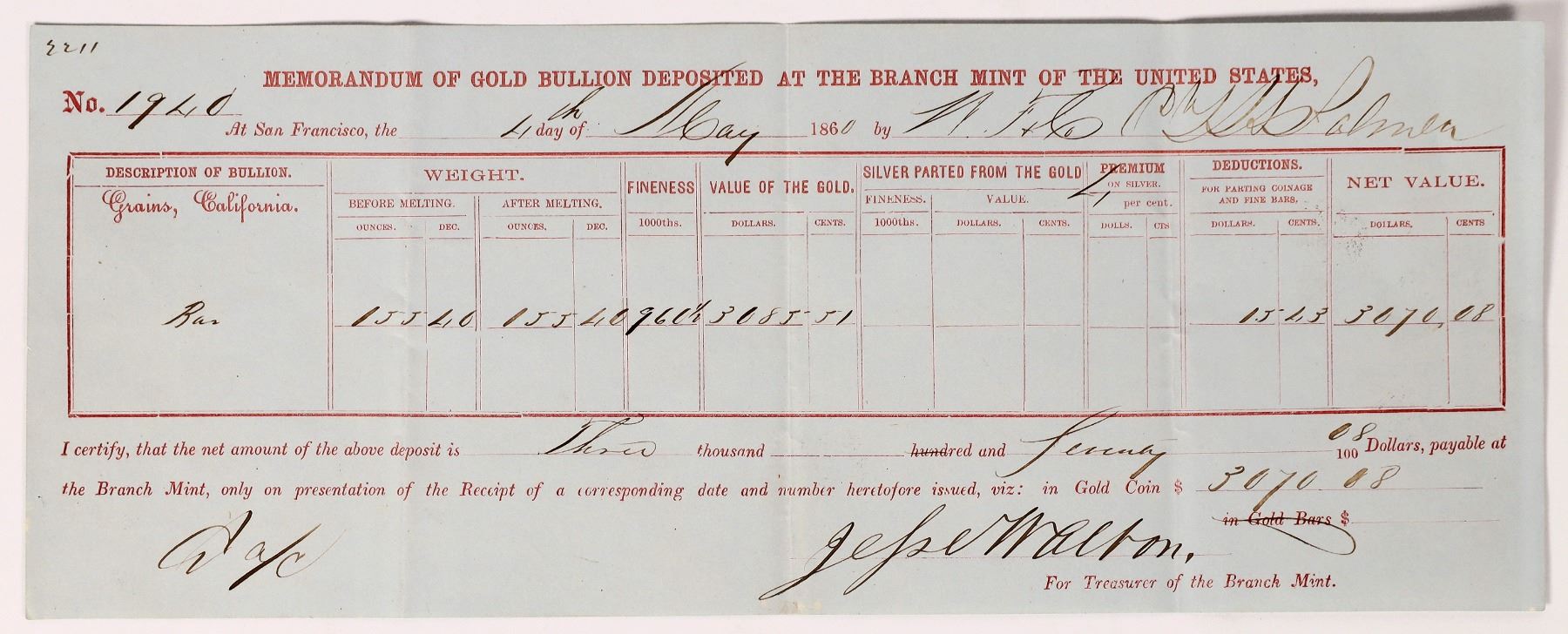 Memorandum of Gold Bullion (No. 1920 ) deposited at the Branch Mint of the United States at San Francisco the 4th day of May 1860 by Wells Fargo & Co., C. T. H. Palmer. (Palmer was the Wells Fargo agent at Folsom). 11 x 4 inches, buff paper with red ink. This is the early US Mint form that contains the word "grains" pre-printed under the column