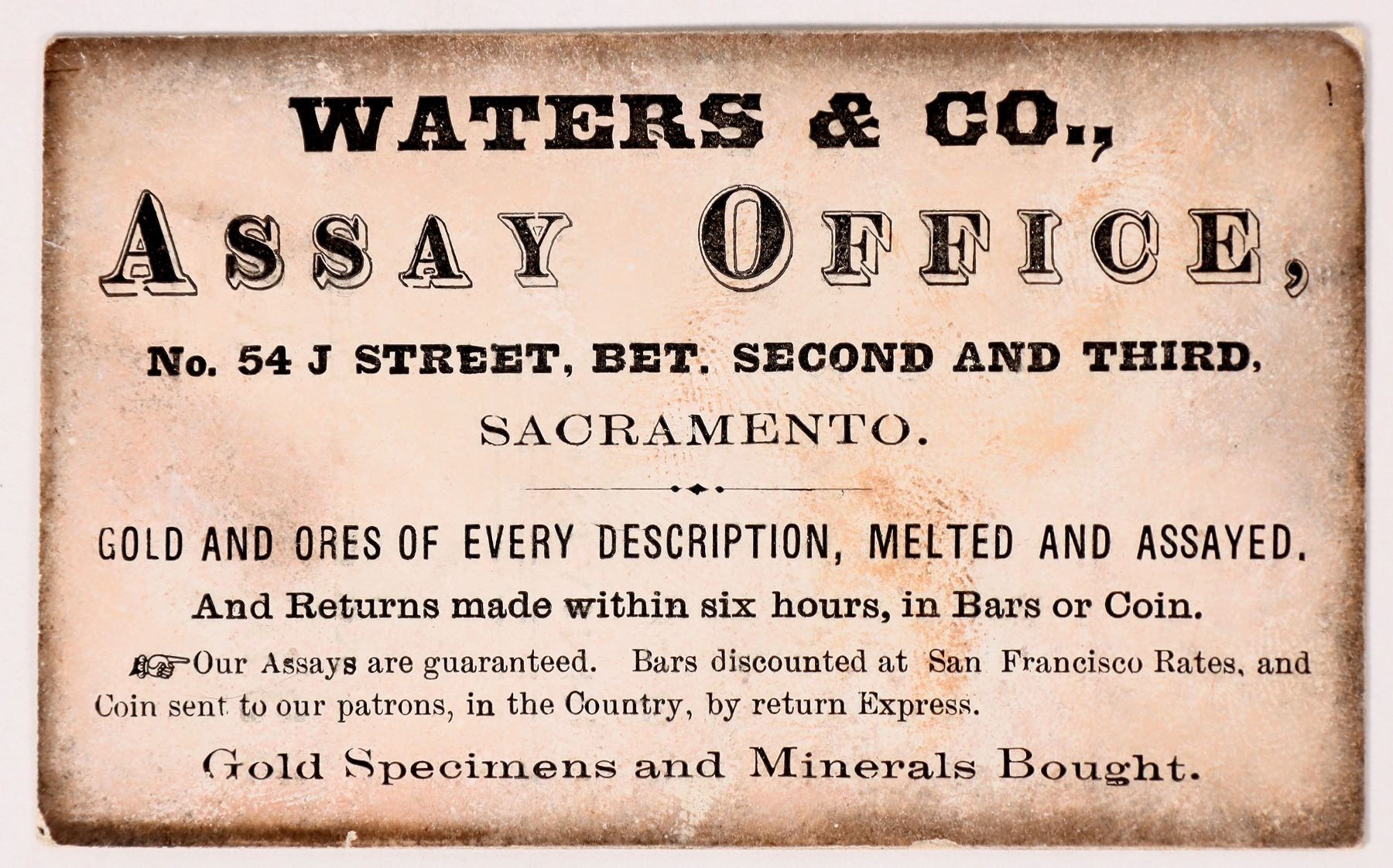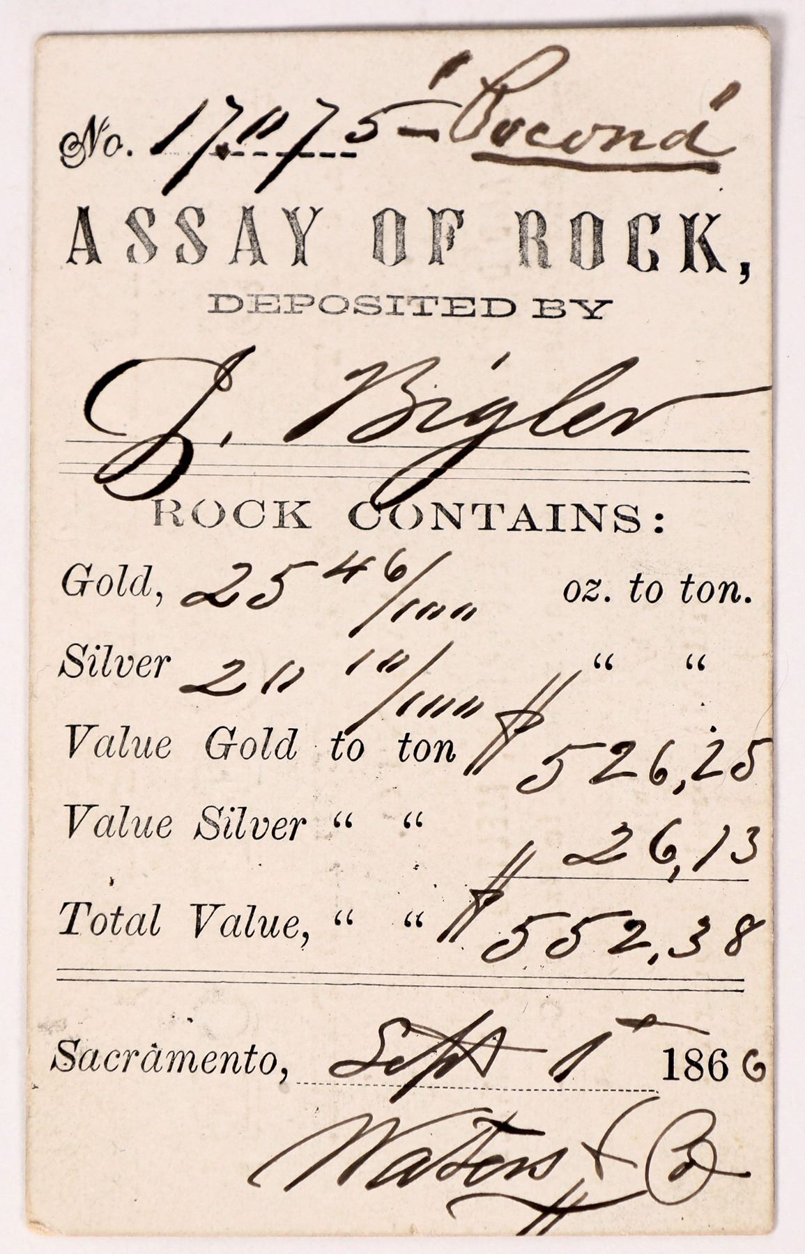 Business card sized (3 1/2 x 2 inches) assay receipt from Waters & Co. Assay Office of 54 J Street, Sacramento (Successor to Blake & Co.) Dated Sept 1st, 1866. Assay of rock deposited by J. Bigler (Governor?) : rock contains: Gold, 25.46 oz. to ton; Silver 20.10 oz. to ton. Total value $552.38. Blake was one of the five California gold assayers whose ingots were recovered on the SSCA. Sacramento California Franklin Collection