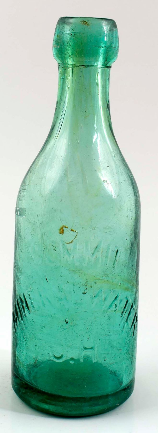 Summit( cu) / Mineral water ( Cu) / J. H. // 1871-1882. Pale greenish aqua, smooth base. Fairly clean, with medium amount of light scratching, throughout the body of the bottle. No chips or cracks. Tiny 1/16" bruise, on the front shoulder , over the letter " M" in Summit. Would polish well...