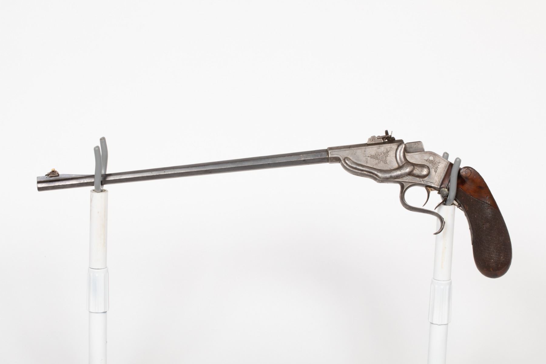 Pistol, SWST-AYDT, Lever action, .22 black-powder target gun. Drop box, blade front/adjustable rear sight. checkered pistol grip, engraved. SN: N/A, JMD Oval Tag: 850, Condition: Good, >