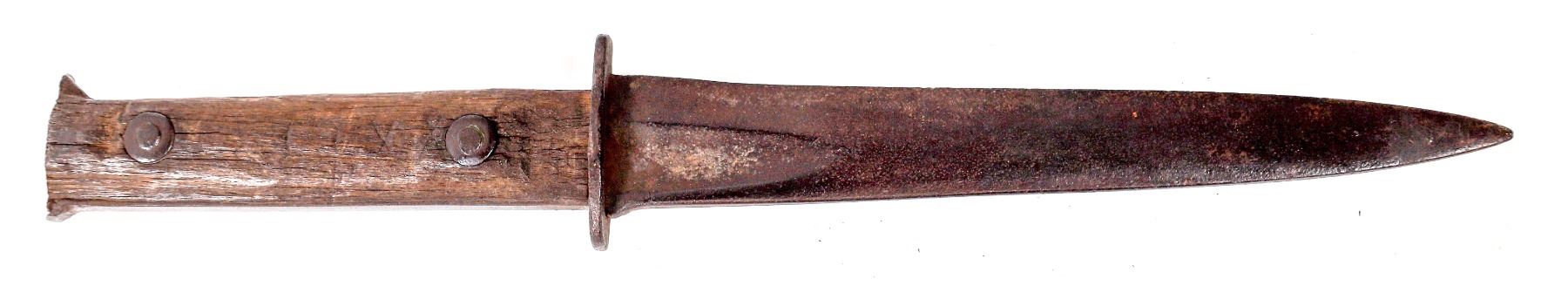 This knife is a repurposed saber blade that has a new life as a knife. The indicator is the last inch of fuller exposed on both sides of the blade. The handle is hand ground to fit the hand, the grips are of a hardwood secured by two rivets; and the guard is formed to swedge at the ricasso. Rough, well made frontier knife. Overall length is 10 1/4 in. with a 6 1/4 in blade. c. 1860's-1880's. Please see photo for details.