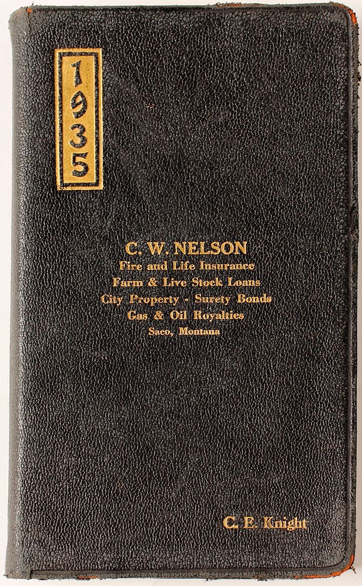 Black leather bound diary from C.W. Nelson, Fire and Life Insurance Farm & Live Stock Loans & the name C.E. Knight embossed at bottom right corner of front cover. About 400 pp.4" x 6.75". Small amount of wear at bottom of diary. Date: 1935 Location: Saco, Montana HWAC# 57527