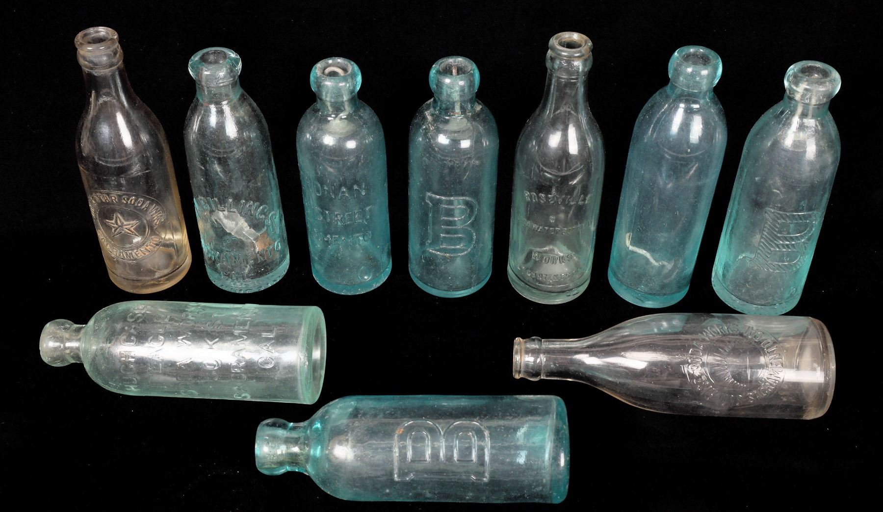 10 Sacramento area soda bottles. Crowntop-Roseville Soda Water Bottling, White Star Soda Works, Sun Rise Soda Works. Hutch-U S W, B, Hugh Casey Eagle Soda Works, B, B, M Cronan-base dings, E L Billings. No apparent chips or cracks Sacramento California