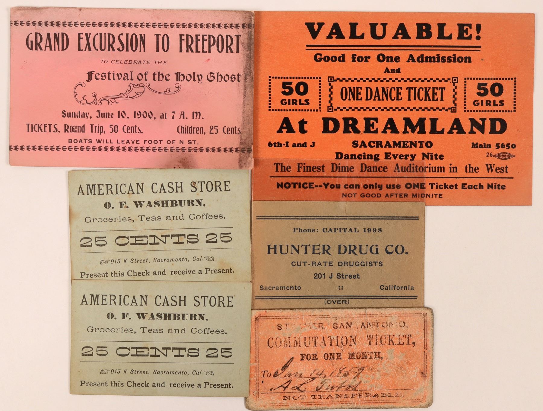 Lot of six pieces: Steamer San Antonio , 1859; American Cash Store; Grand Excursion to Freeport, 1900; Hunter Drug Co. ; Dreamland (Finest Dime Dance Auditorium in the West). Ex: Ron Lerch Collection.