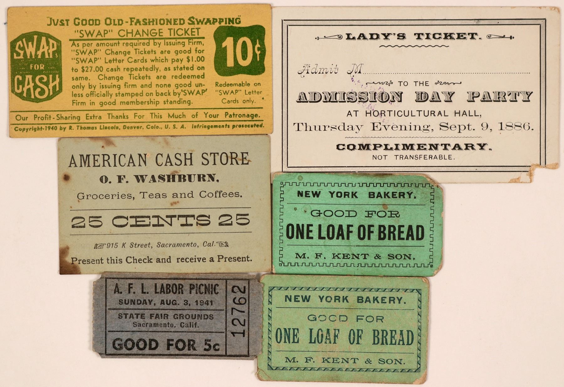 Lot of six: American Cash Store; New York Bakery; A.F.L. Labor Picnic; Cross Roads Grocery; Lady's Ticket to the 1886 Admission Day Party at Horticultural Hall. Ex: Ron Lerch Collection.