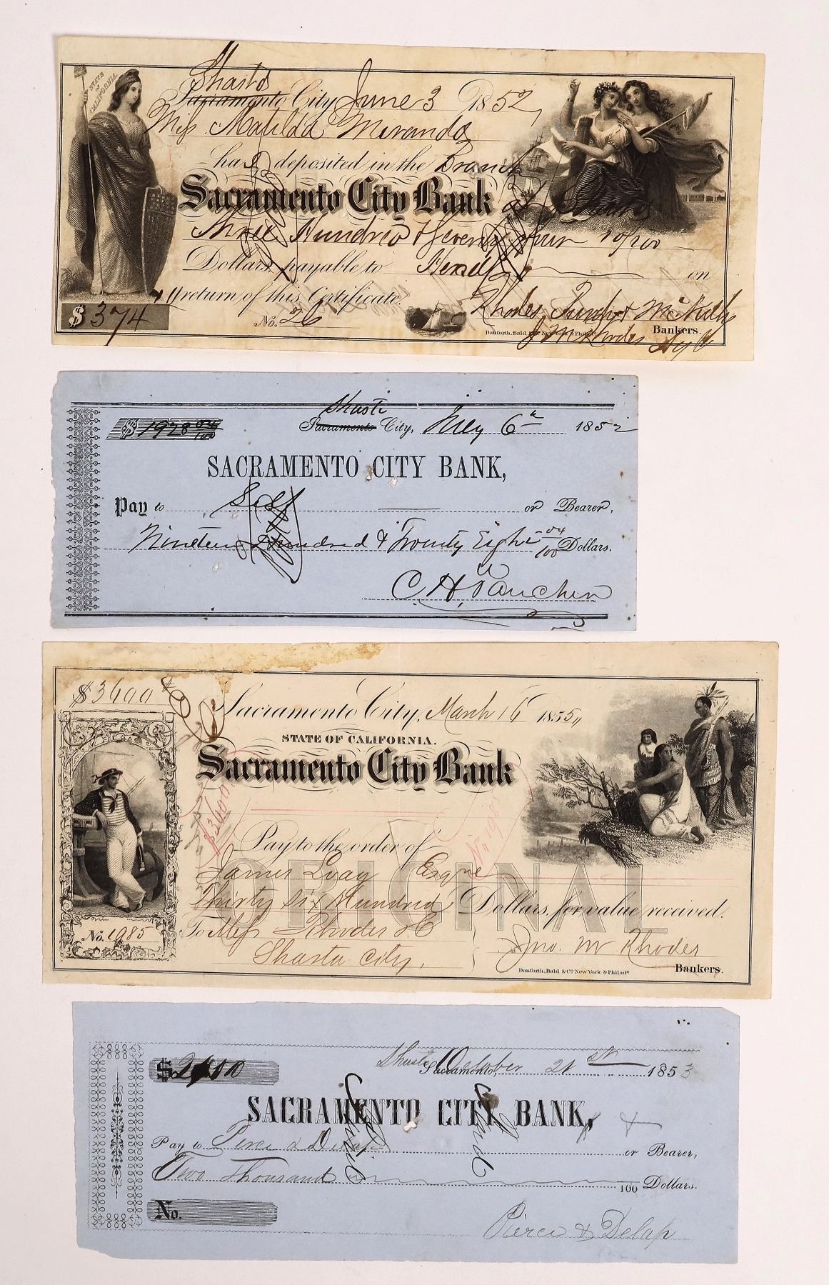 Four checks from the Sacramento City Bank in Shasta, California. "Sacramento" is crossed out and "Shasta" is written above on 3 of the three checks. The other one is signed by James M. Rhodes, the agent in Shasta. These checks are from 1852, 1853, and 1854. Two do not have vignettes but the other two do. Good condition. Sacramento California 1852-54