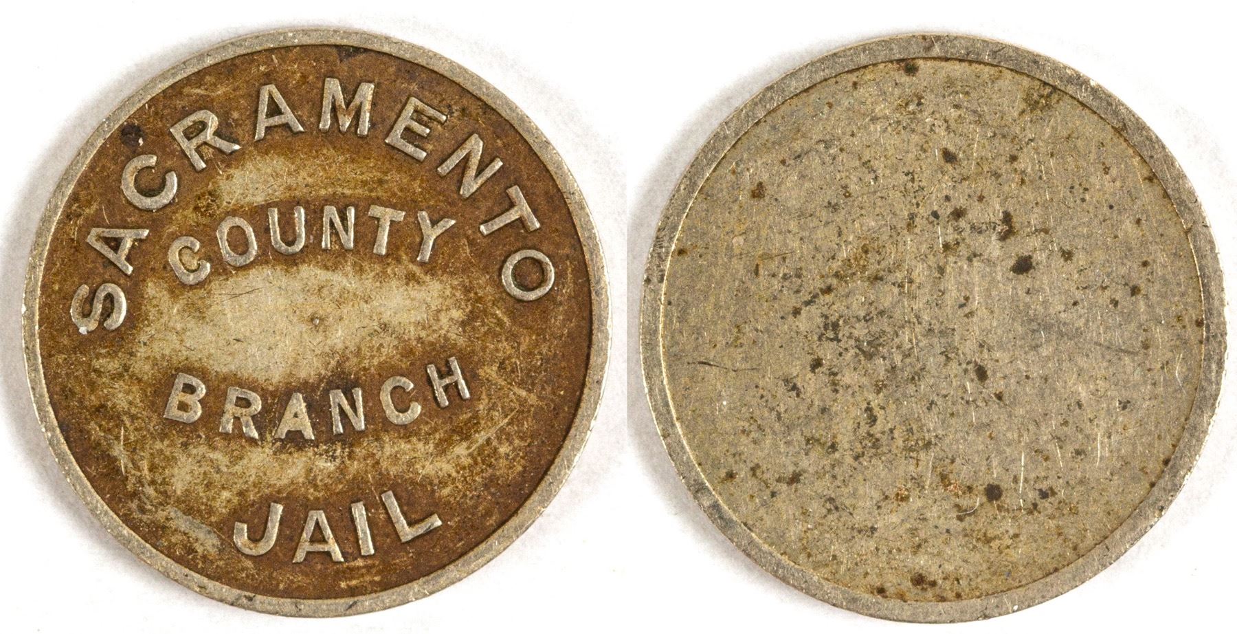Very rare K 837, only three or four reported. Obv.: Sacramento / County / Branch / Jail; Rev.: blank. Wm, rd., 15 mm. State: California City: Sacramento Date: ID# 77766