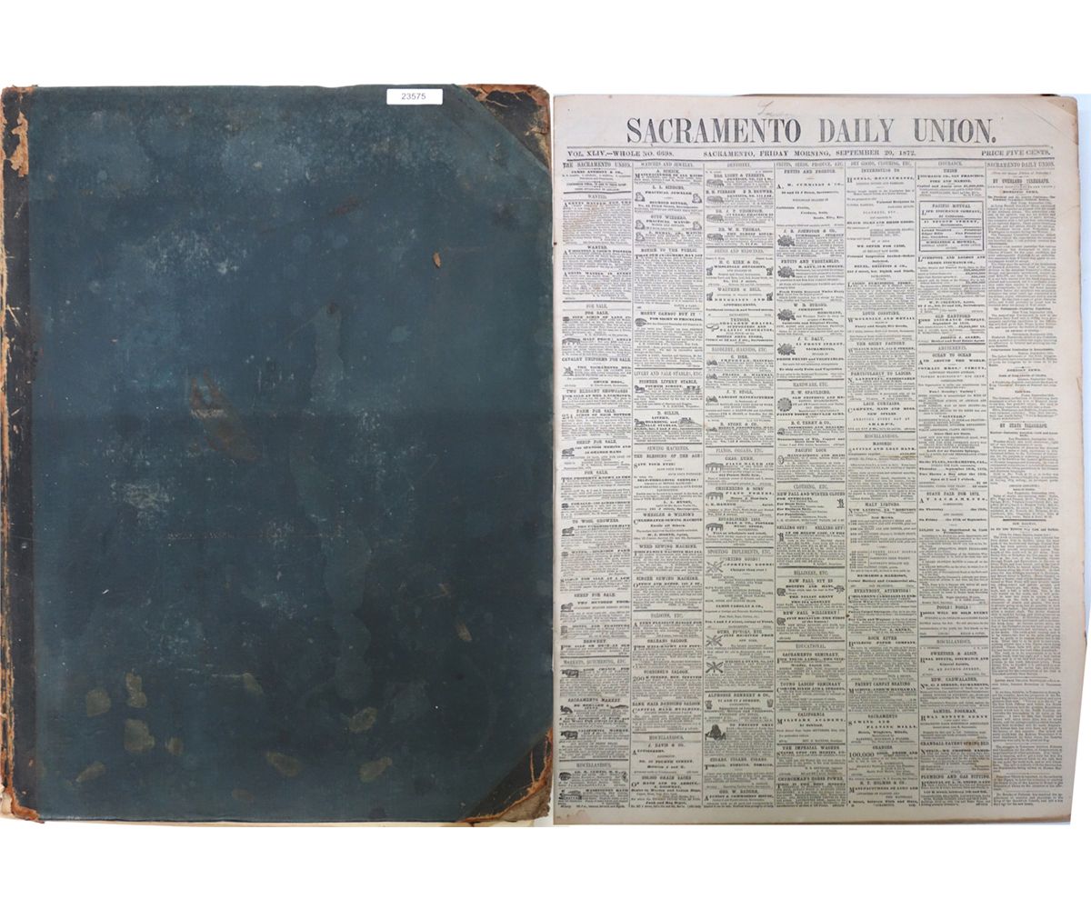 Bound volume of newspapers from September 20, 1872 to March 18, 1873. Excellent research tool for mining history, telegraph history, and all history in and around Sacramento. Very Good. Prag Collection.