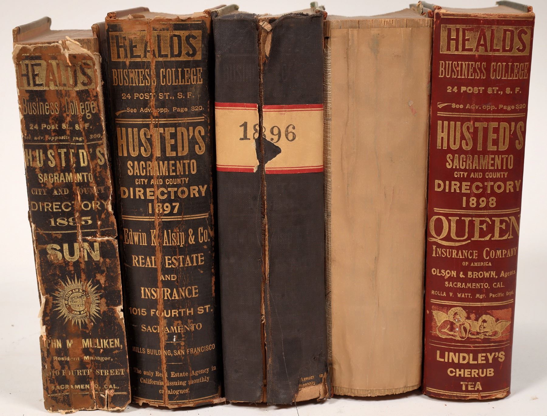 Five volumes of the Directory of Sacramento City and County published by F.M. Husted in 1895, 1896, 1897, 1898, and 1899. F.M. Husted was one of the most prominent publishers in Sacramento who would later merge his company with Crocker Publishing Co. These directories list the names and street addresses of businesses, residents, government offices, schools, societies, etc. in the Sacramento area. These directories also contain business advertisements on the covers and throughout the volumes. Some businesses include their telephone numbers in their advertisements. 9 x 6, minor damage to some binding.