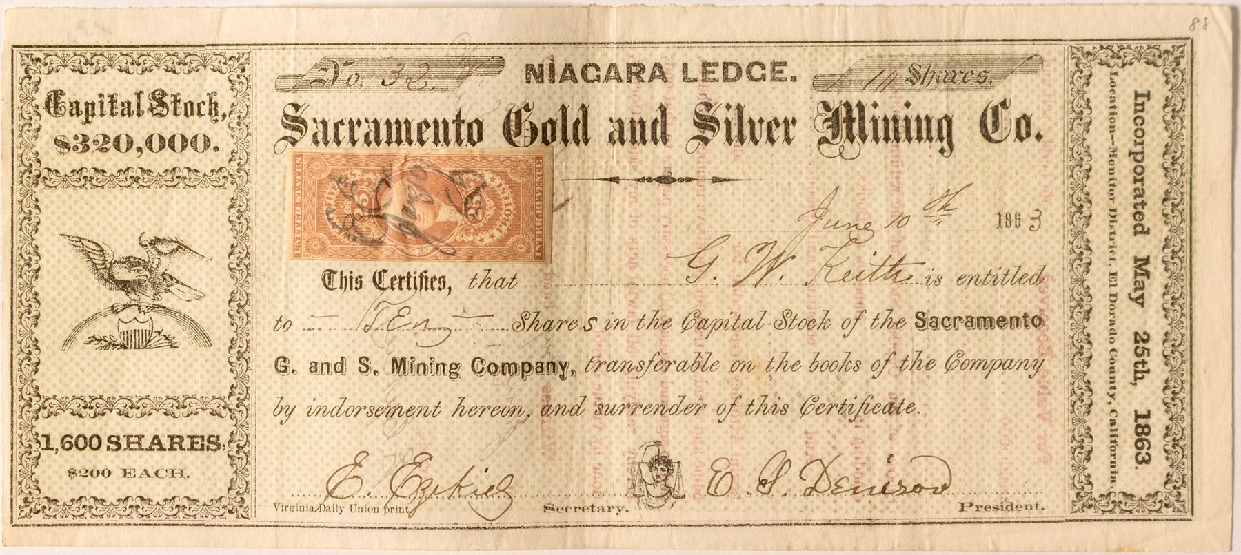 Stock certificate 33 for 10 shares to GW Keith on June 10, 1863. Signed by E Ezekiel and EG Dension. Large US 25c stamp. Signed by Keith on reverse. Located in the Monitor Mining District, El Dorado County. On March 16, 1864 Alpine County was created out of El Dorado County. This mining district was part of Alpine County. Five mining districts (or so) had been established by September 1863 in this region: Silver Mountain, Monitor, Raymond, Mogul and Alpine [Jackson 1964:11; Reed 1864]. Probably the most important mining district in Alpine County was the Monitor District, located in the steep canyon of Monitor Creek. In "Statistics of Mines and Mining in the States and Territories West, 1869" nine mining operations are mentioned. The Sacramento is not one of them. As a matter of fact, we found no information on the Sacramento Mine. Some light folding and a minor dog ear on top right. Other than that it is in fine condition. HWAC# 53585 Date: Location: Monitor Mining District, California