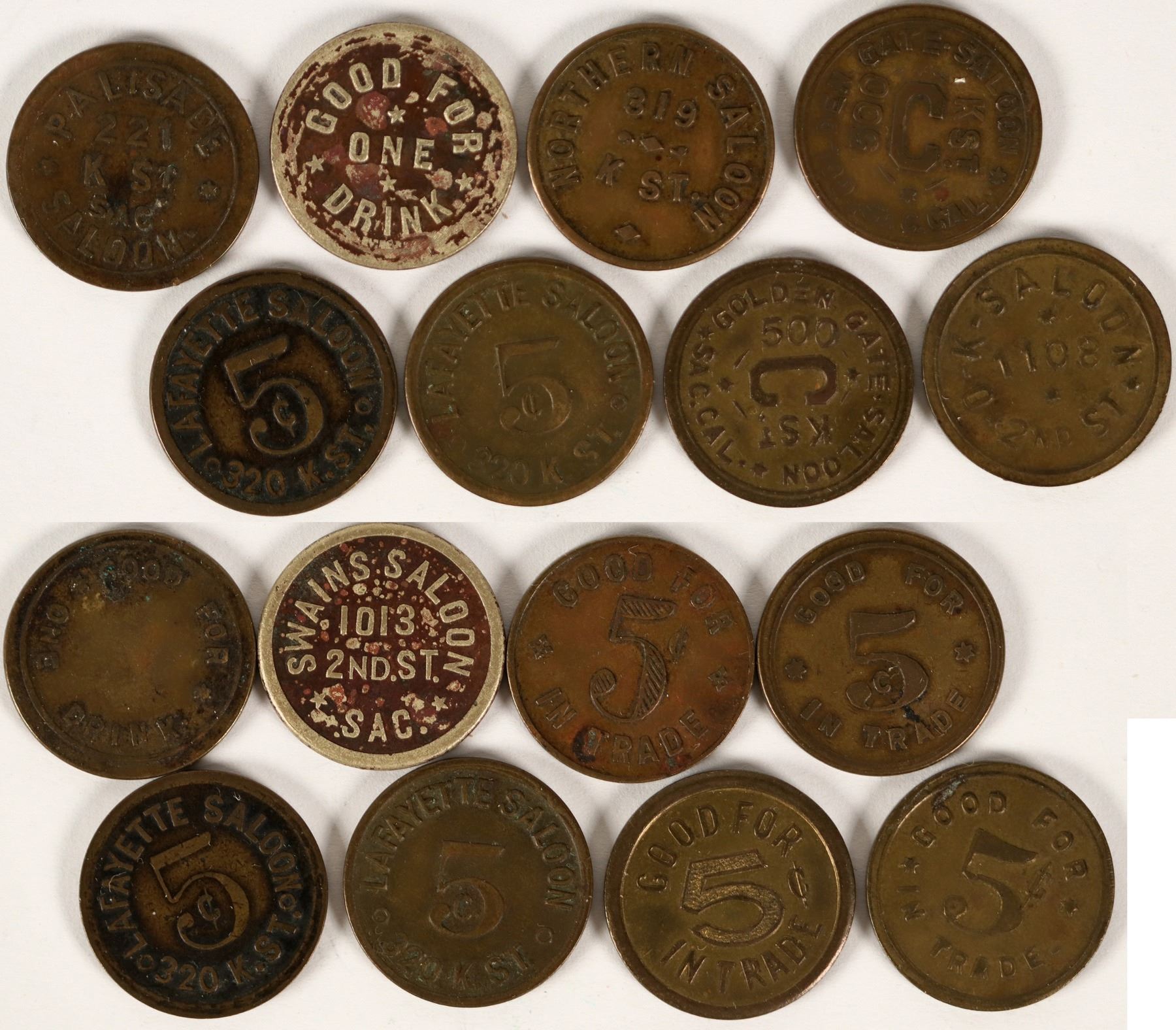 Tokens include: Golden Gate Saloon, 500 K st. (2) 5ct; Lafayette Saloon, 320 K St., 5 ct.- 2 varieties; Palisade Saloon,221 K st. Good for 1 drink; O.K. Saloon, 5 ct.; Swains Saloon, 1013 2nd st. GF1 drk; Northern Saloon, 319 K st. GF 5 cts. in trd.