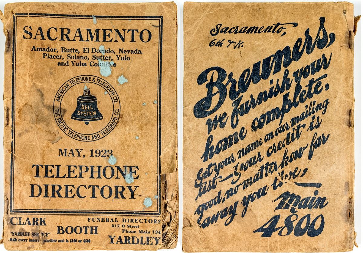 Telephone book for Sacramento as well as Amador, Butte, El Dorado, Nevada, Placer, Solano, Sutter, Yolo, and Yuba Counties. American Telephone & Telegraph Co. The Pacific Telephone and Telegraph Co. Bell System. May 1923. State: California City: Sacramento Date: 1923 FHWAC#: 40167