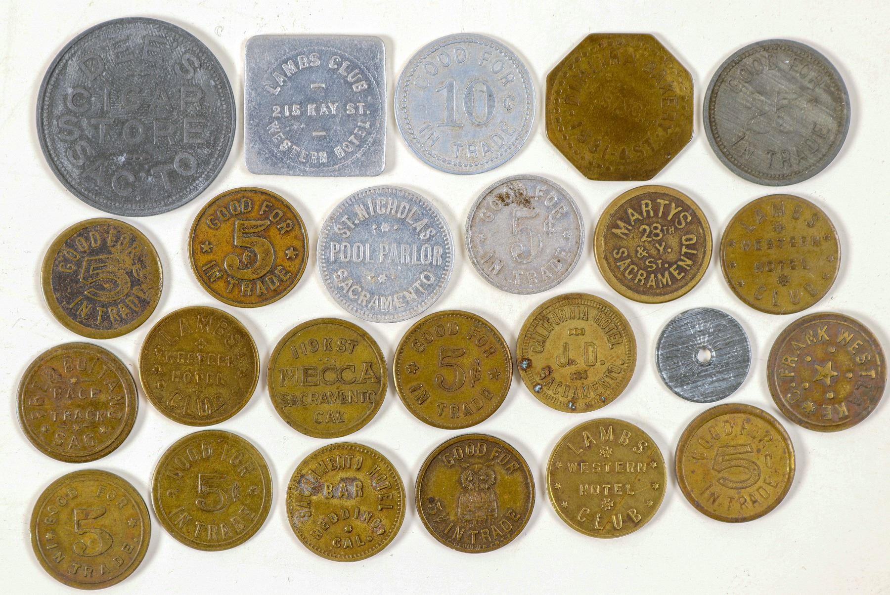 Lot of 24 Sacramento tokens, with the Sacramento Hotel of Redding sneaking into the group. . Salvatore Falcone Collection
