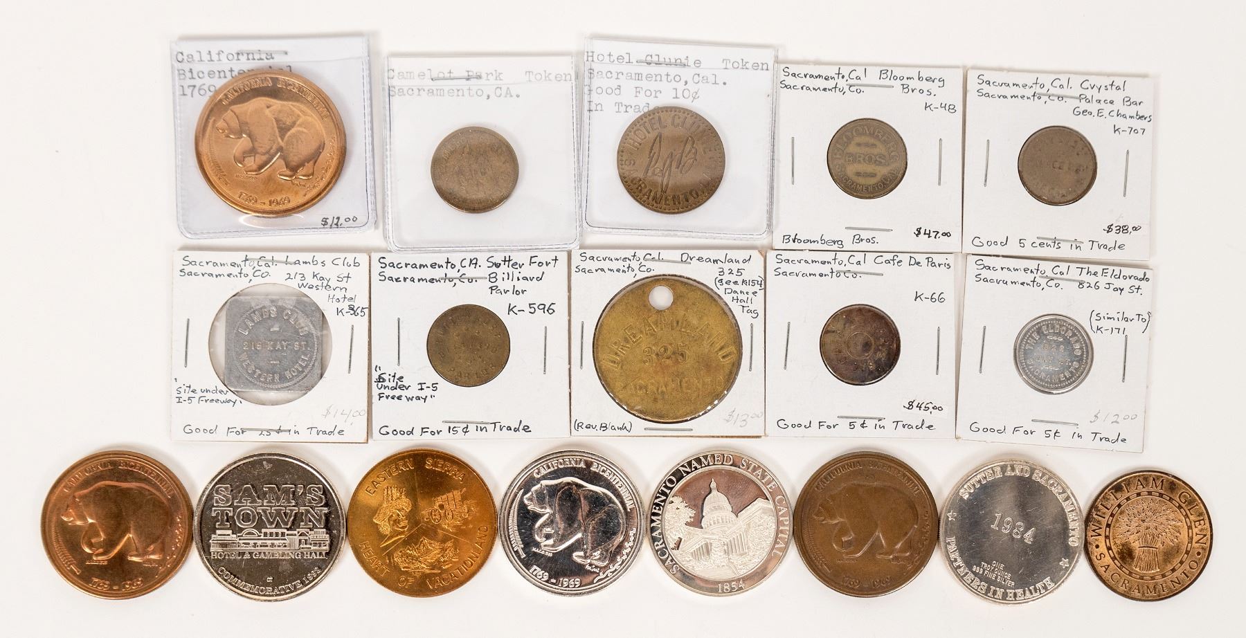 19 Sacramento tokens. Silver-1.5" Sutter and Sacramento, Sam Boyd, California Bicentennial, Sacramento Named State Capital. Non silver-Bicentennial, Hotel Clunie, Bloomberg Bros., Lambs Club, Camelot Park, Dreamland etc. See photo. Sacramento California