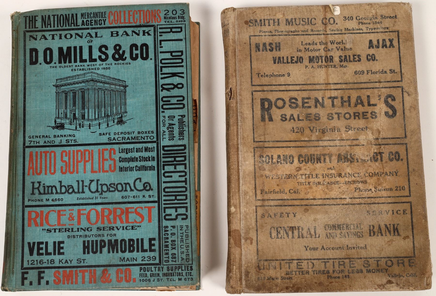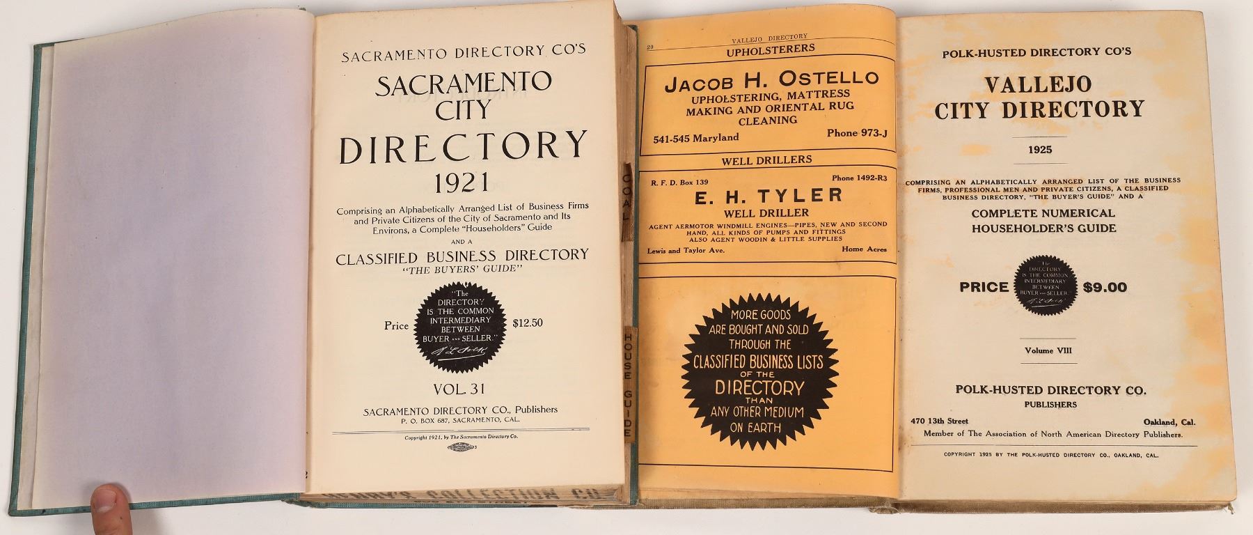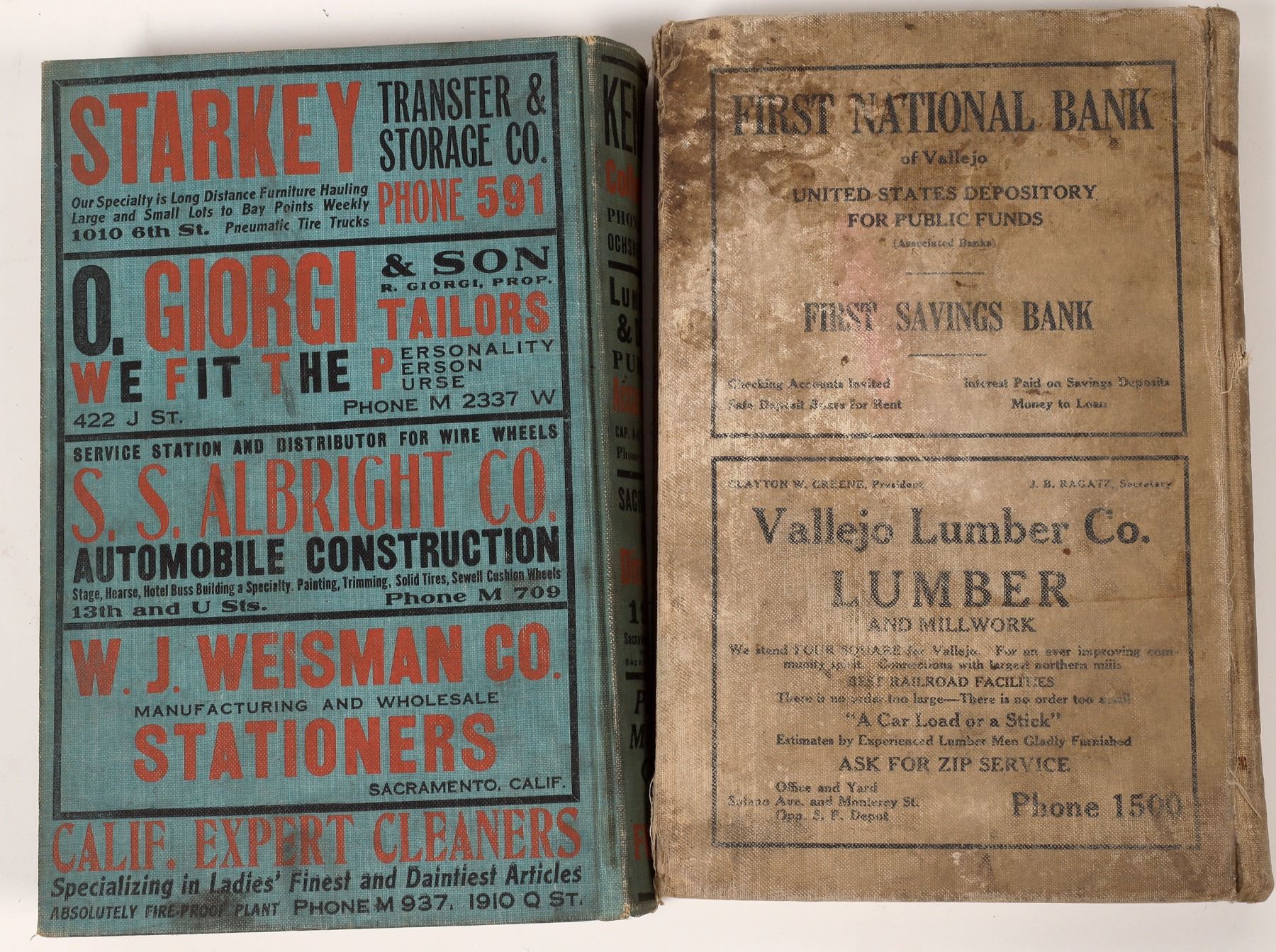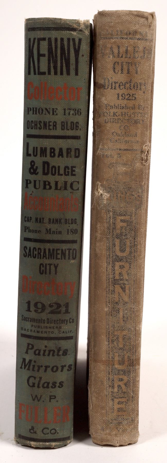 1.) 1921 Sacramento City Directory by the Sacramento Directory Company copyright 1921, blue boards, generally fine, 656 pages, 6x9" format, 2.) 1925 Vallejo City Directory by Polk-Housted published out of Oakland. Water stains and water damage to cover, 276 pages. Two nice directories.