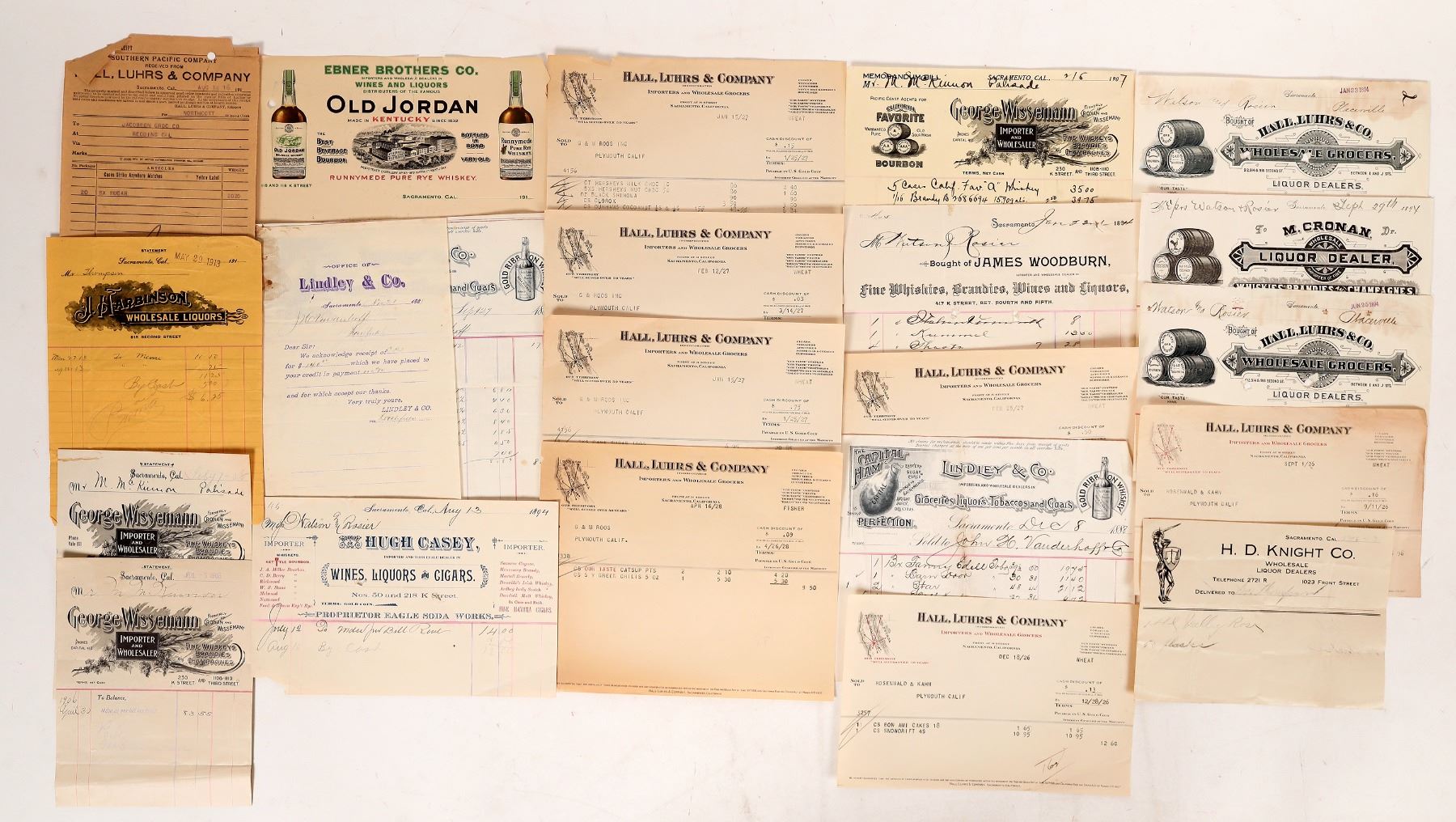 About 22 Sacramento whiskey billheads and letterheads. Some pictorials, 1 color. Nice group. c. 1894-1928. Sacramento California
