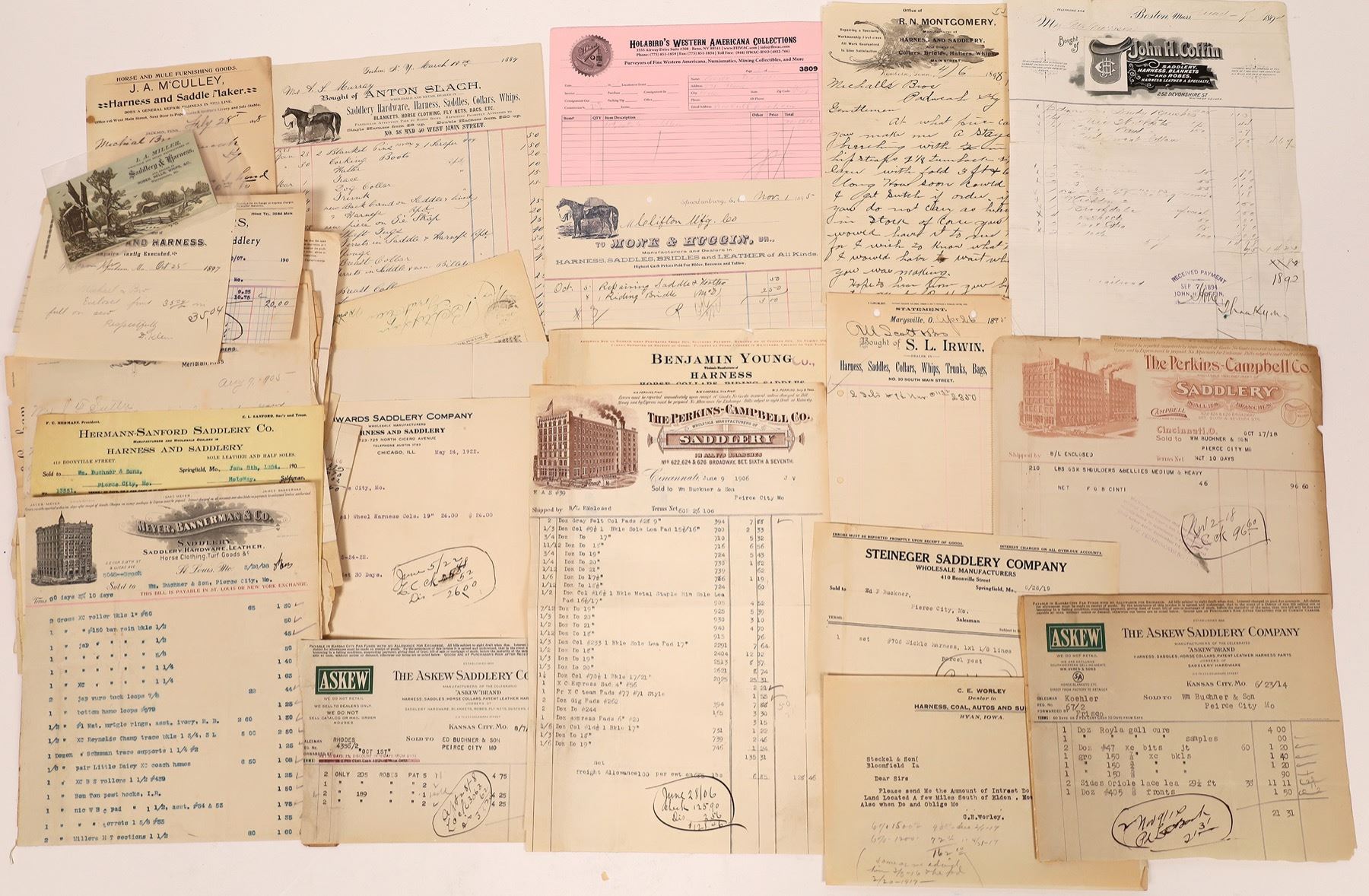 Lot of 70: Bills/invoices from a variety of saddlery companies in existence throughout the US, most from the early 20th century. Ex: Lovan Saddlery Co, Springfield, MO; George Windheim Saddlery Hardware, Utica, NY, etc. Of special interest is a handwritten bill on Anton Slach (Goshen, NY) company stationary, dated March 18, 1884 detailing 26 line item purchases for a total of $29.55. Note at bottom reads Revd Payt 4/2/84 A Slach. All handwritten. Three small tears on right edge crease marks, in excellent condition. This impressive collection includes several other bills from the 1890s including an undivided back postcard from the Konantz Saddlery Co, St. Paul, MN pre-printed with 1893 date and postmarked June 2, 1894. State: City: Date: Provenance: