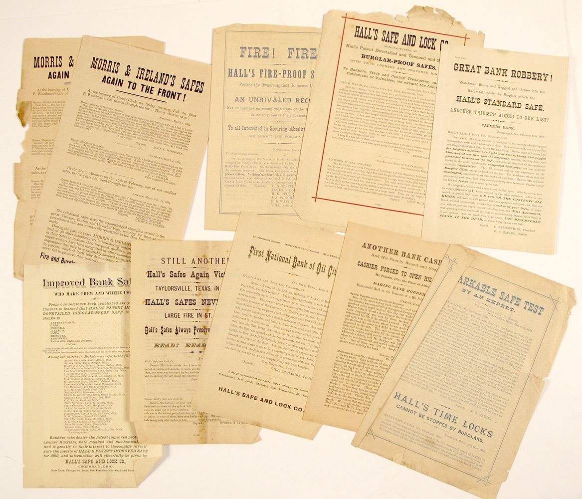 Lot of 10 handbills from various US Safe manufacturers that advertise the reliability of their products by mentioning failed robberies. One for Hall's Standard Safe is titled "Great Train Robbery!" and described a train robbery on January 2nd, 1883 where robbers tried to get into the safe using "all the appliances known to the craft, including the compound blow-pipe, and that powerful 'dynamite.'" Eight of the documents are testaments to Halls. The other two are for Morris & Ireland's Safes. Overall ,the group has folds, tears, and toning. Please inspect. A fun Old West group! (Prag Collection) Date: Location: United States HWAC # 55600