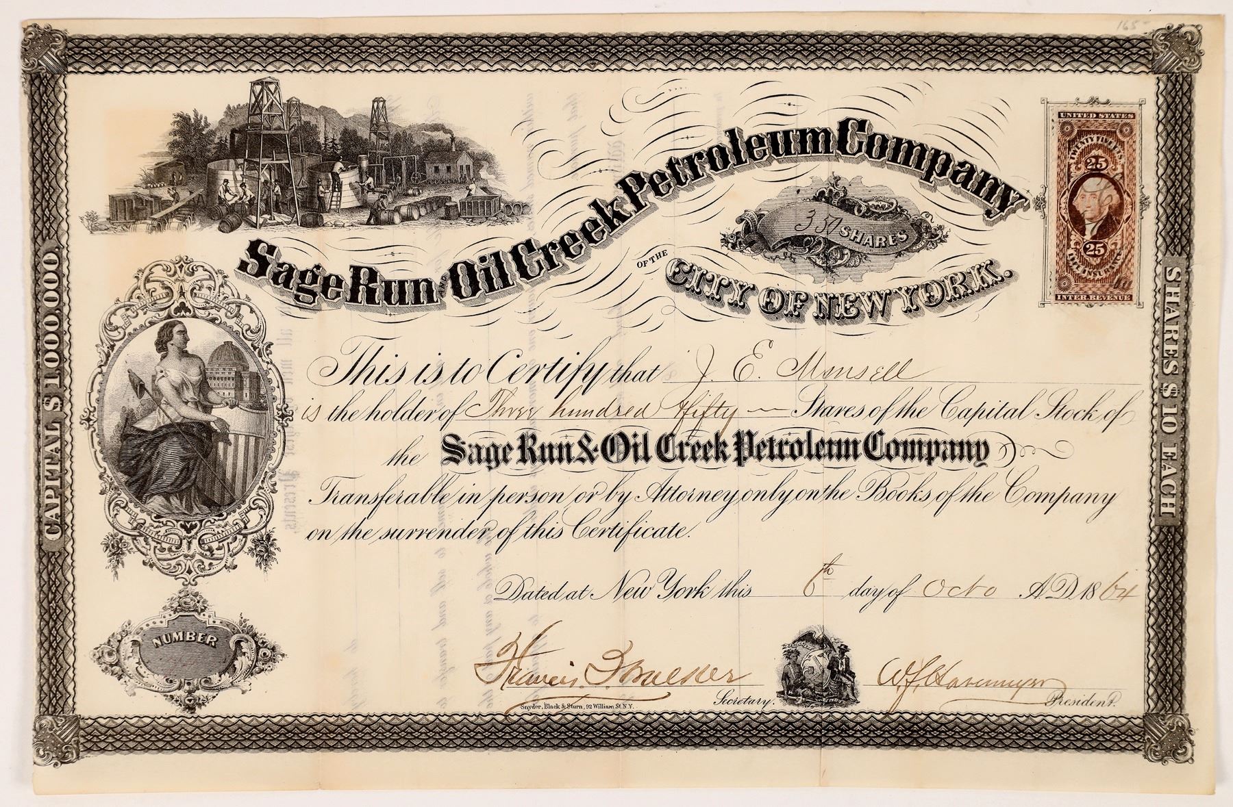 "of the City of New York." No. 74, issued for 350 shares to JE Monsell in 1864. Signed by the president and secretary (illegible). Not cancelled. Oil field vignette at upper left and allegorical woman below. Printed by Snyder, Black & Sturn, NY. 25 cent US IR Life Insurance stamp at upper right. Deep folds, some discoloration. 7.5 x 11.5" Oil properties were at Cranberry & Cornplanter townships in Venango County, Pennsylvania (New York Daily Herald, 21 Oct 1868). Venango County Pennsylvania 1864 Ken Prag Collection