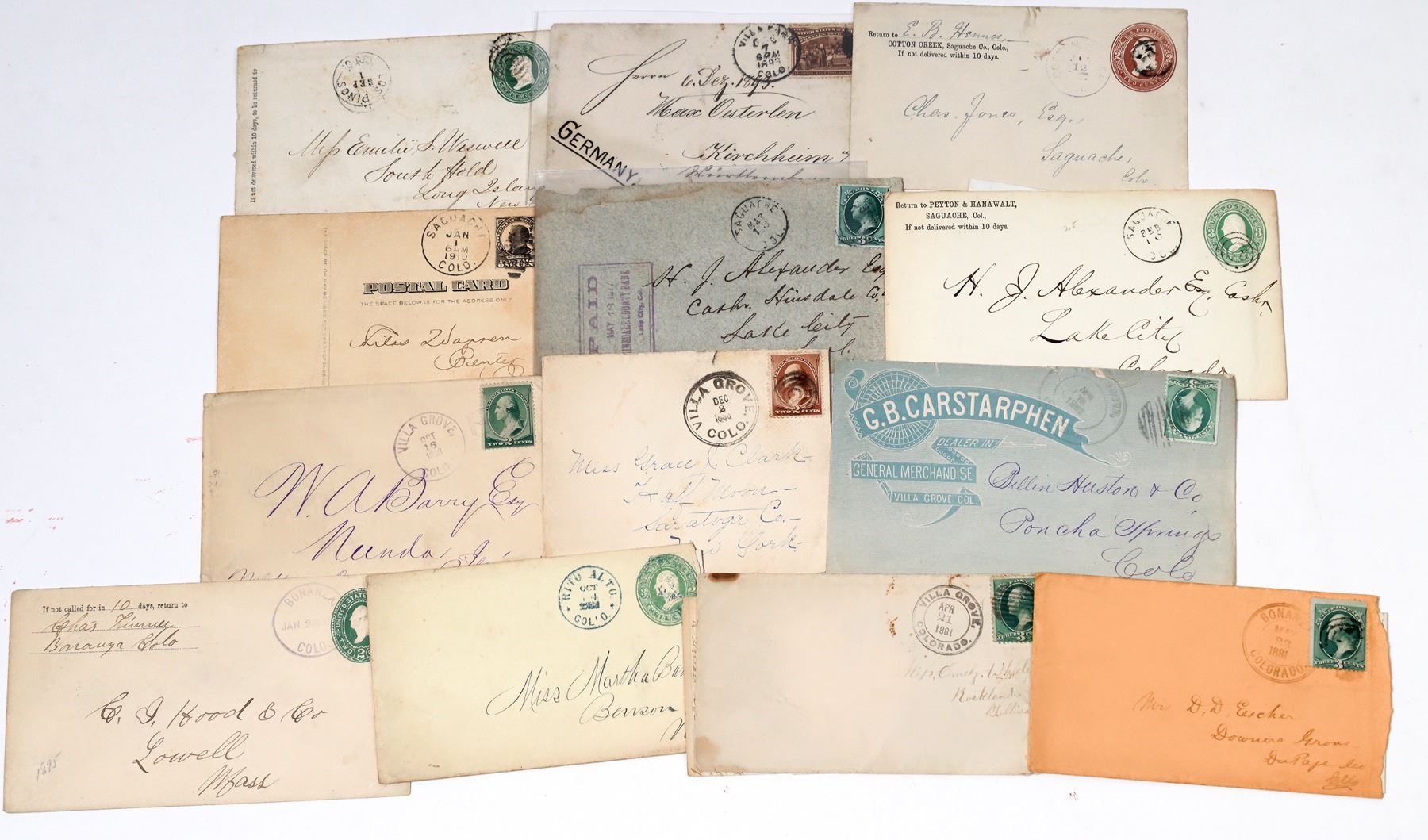 Lot of 13. 1) Bonanza, Colorado. Two pieces: 1881 double ring cancel with two page letter that mentions Leadville and that the letter writer is going "prospecting with hopes to find a mine...". And 1895 cover. 2) Villa Grove. Four covers: full face advertising for GB Carstarphen, General Mer. 1882; 1881 cover; 1886 cover; and 1888 cover, all different cancels. 3) Saguache. Three pieces: cc for Peyton & Hanawalt, 1877, with letter; 1877 cover to Hinsdale Bank with Paid stamp from Bank; and 1910 postal card. 4) Others: Cotton Creek cc, 1887; Villa Park, 1893; Los Pinos, c.1870s; and Rito Alto 1881 cover with letter.
