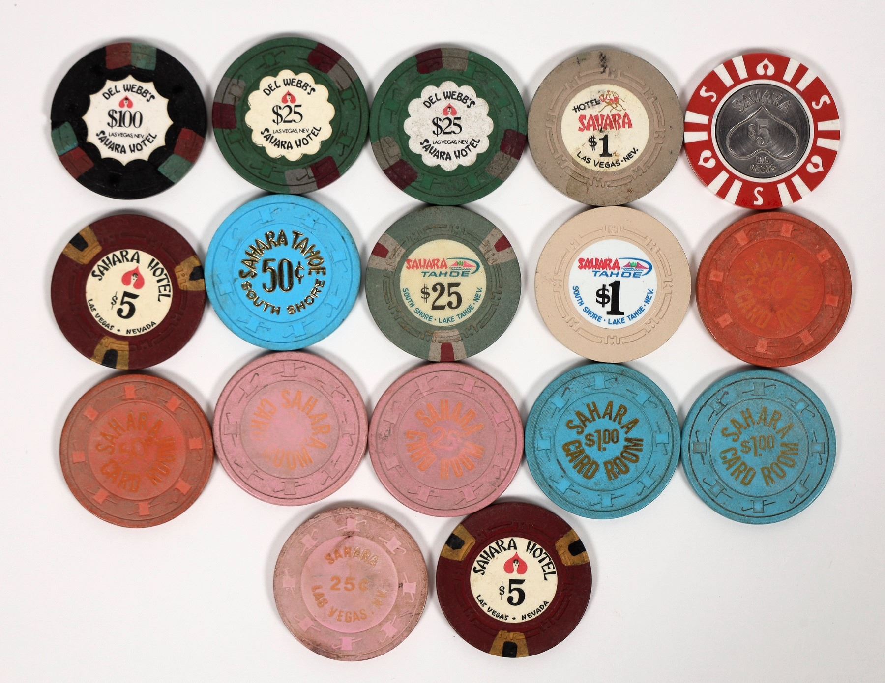 In 1961, Del Webb purchased the Sahara Hotel, the Mint and the Lucky Casino and become the first publicly traded gaming corporation. This lot contains 17 gaming chips from Del Webb's legacy: Sahara Hotel Las Vegas (8): $100, $25 (2), $5 (2), $5 (white metal inner core), $1, 25 cent. Sahara Tahoe (3): $25, $1, 50c. Sahara Card Room (6): 25c pink (2), 50c orange (2), $1 blue (2).