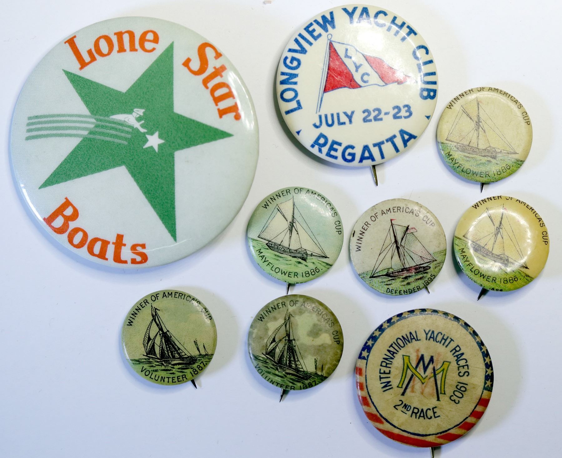 Lot of nine: six commemorate the Winner of the America's Cup in 1886(3), 1895, 1887(2), made by Whitehead and Hoag, issued by American Pepsin Gum Co. Also: Longview Yacht Club, Lone Star Boats and 1903 International Yacht Races.