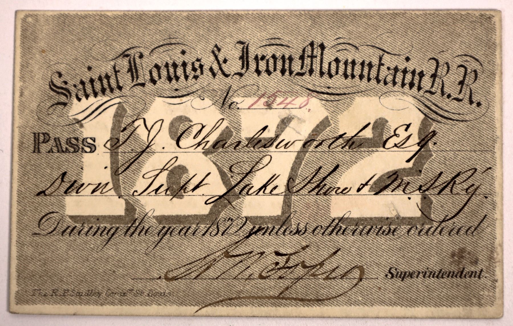 Saint Louis & Iron Mountain Railroad pass for 1872 issued to T. J. Charlesworth; map of the railroad's route on the reverse. State: City: Date:1872 Provenance:
