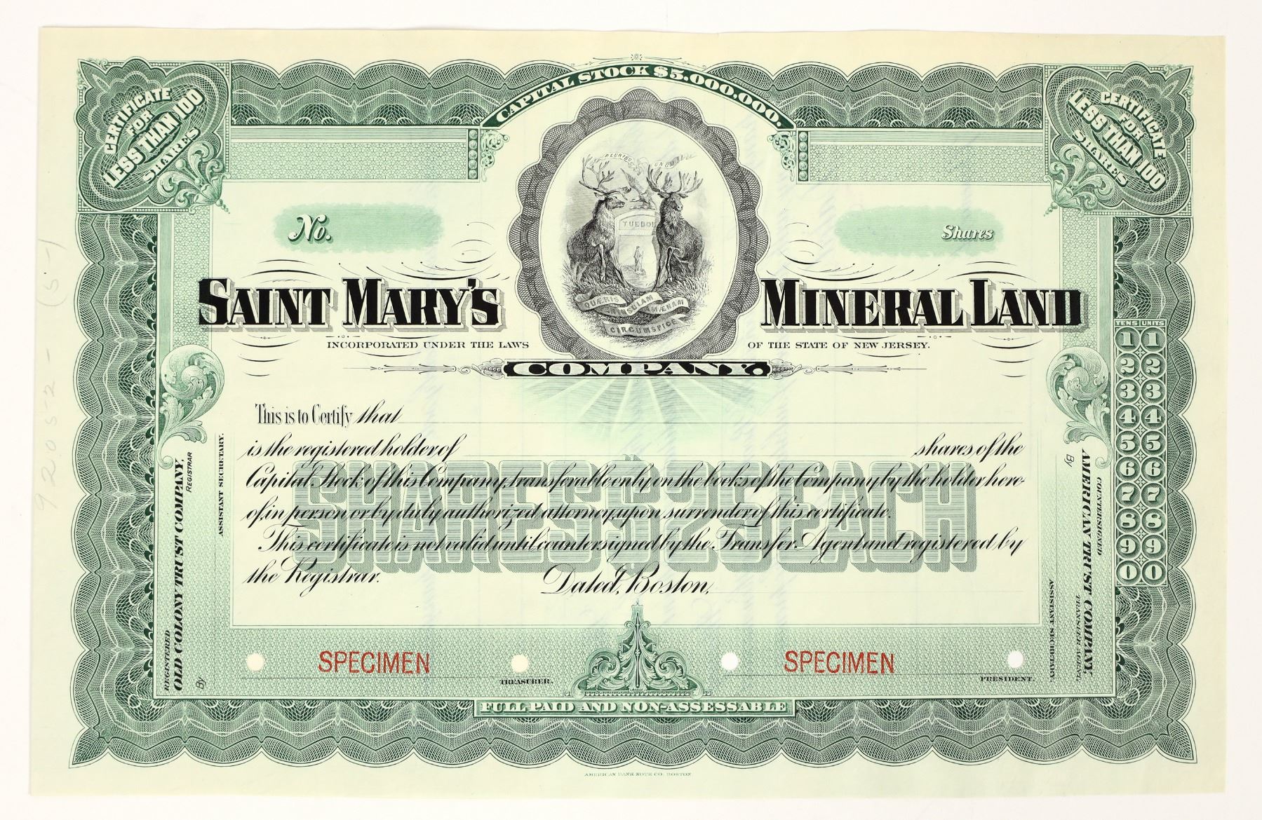 Inc. in New Jersey. Specimen stock. Green border and background, black print, and vignette of elk with shield. American Bank Note Company. 7 x 11" DeGood pgs. 327-328. R-7. Only known stocks are also specimens. Owned 109,312 acres in Houghton, Ontonagon, and Keweenaw Counties. Inc. 1901.