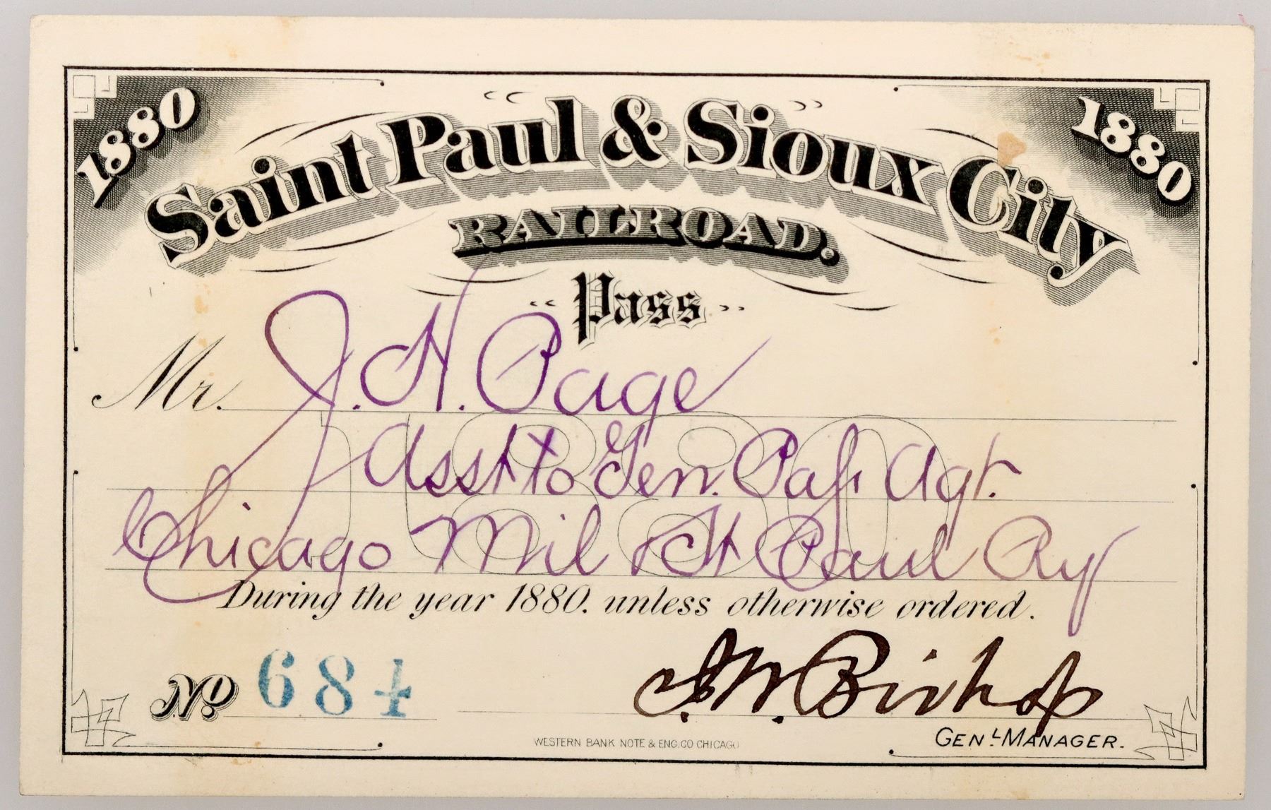 Pass no. 684, issued to JH Page of the Chicago, Milwaukee & St. Paul Railway for 1880. Signed by general manager Bishop. Western Bank Note & Eng. Company. Reverse lists the 465 miles of track. Stamped in blue on the reverse. In 1866, the Saint Paul and Sioux City Railroad line from St. Paul to Belle Plain was completed. Originally known as the Minnesota Valley Railroad company and incorporated by an act of the Minnesota Legislature approved on March 4, 1864.