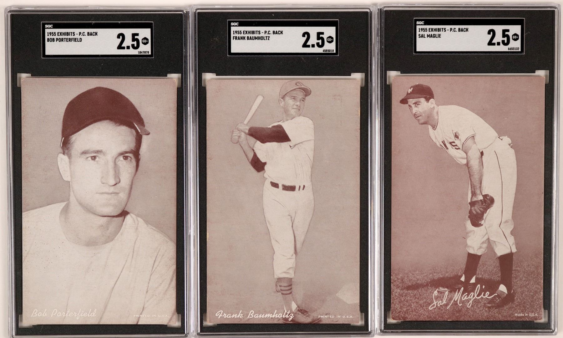 This lot includes Sal Maglie, known as "The Barber" for his penchant for pitching inside and giving hitters a close shave. Also included are outfielder Frank Baumholtz and right-hander Bob Porterfield. All cards are in good condition. See p[hotos for more detail.