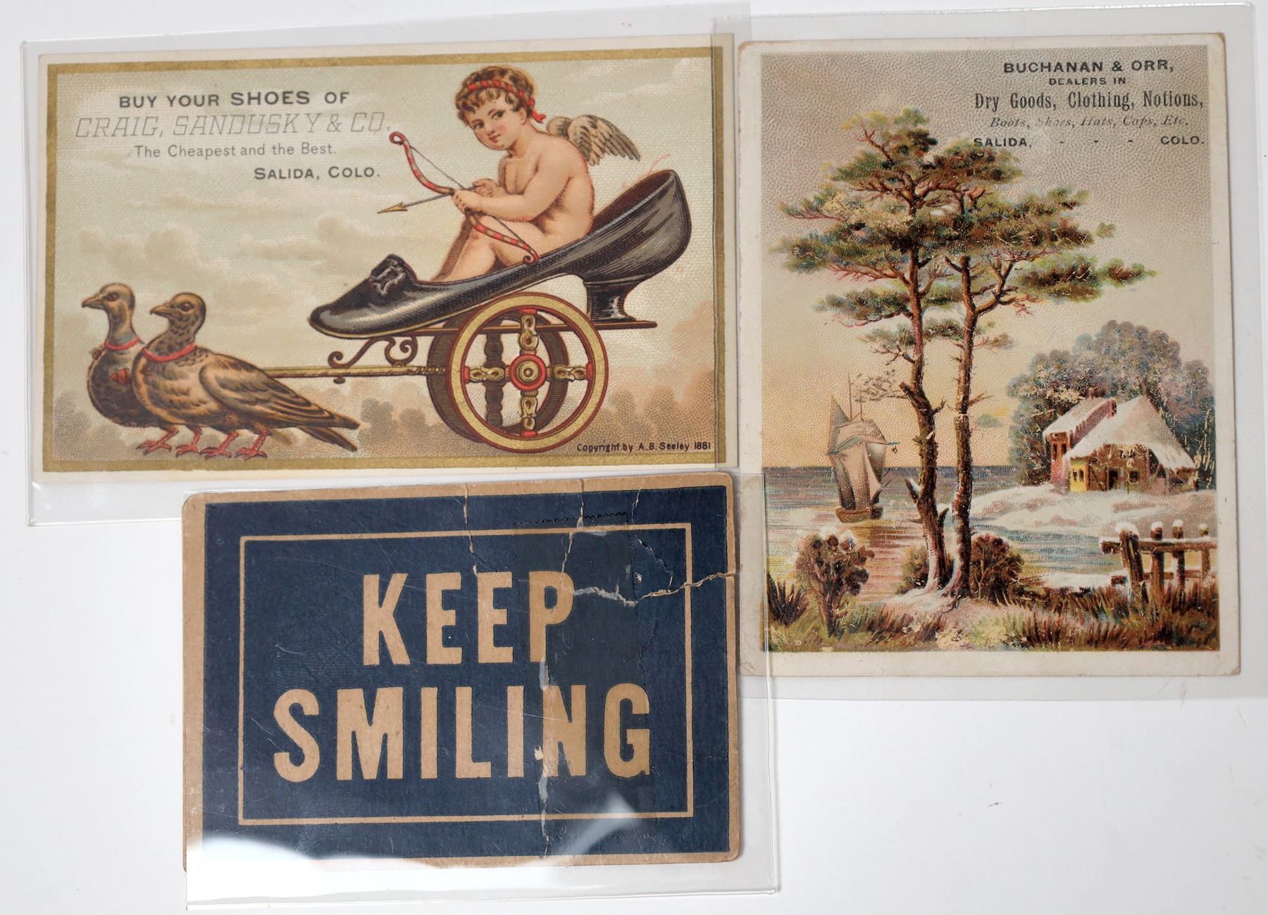 Lot of three different trade cards from businesses in Salida, Colorado, c. 1880s-1910s. They are from Buchannan & Orr, Dealers in Dry Goods, Clothing, and Notions, Craig, Sandusky & Co., and Grace Taylor, D.C., Ph. C. Different sizes, largest is 4.75 x 3 inches. Good condition, in protective sleeves.