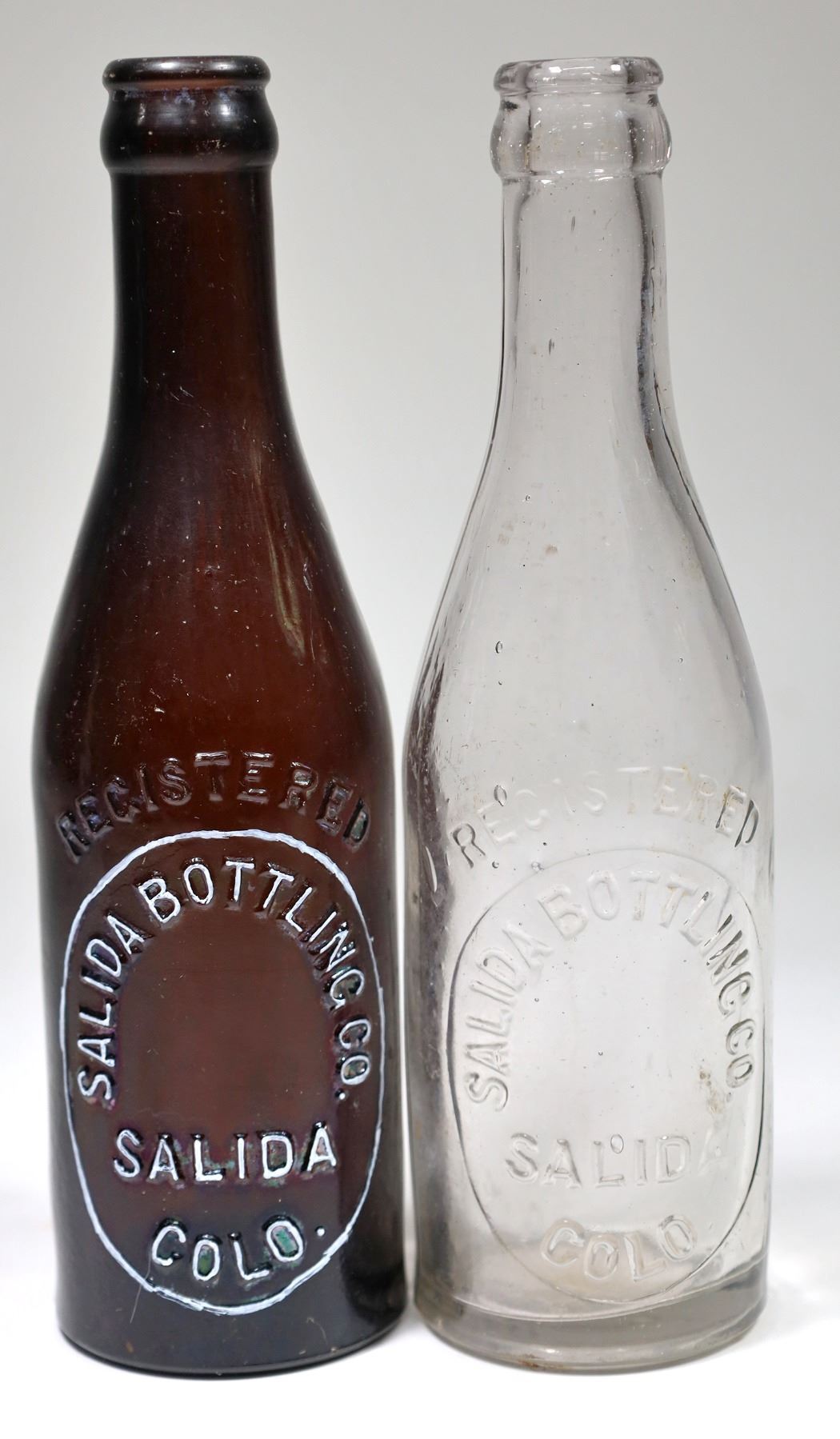 Clear, Registered/Salida Bottling Co./Salida Colo. 1 base ding. Dark amber, Registered/Salida Bottling Co./Salida Colo. Wear on back, ding, small scratch. No apparent chips or cracks.