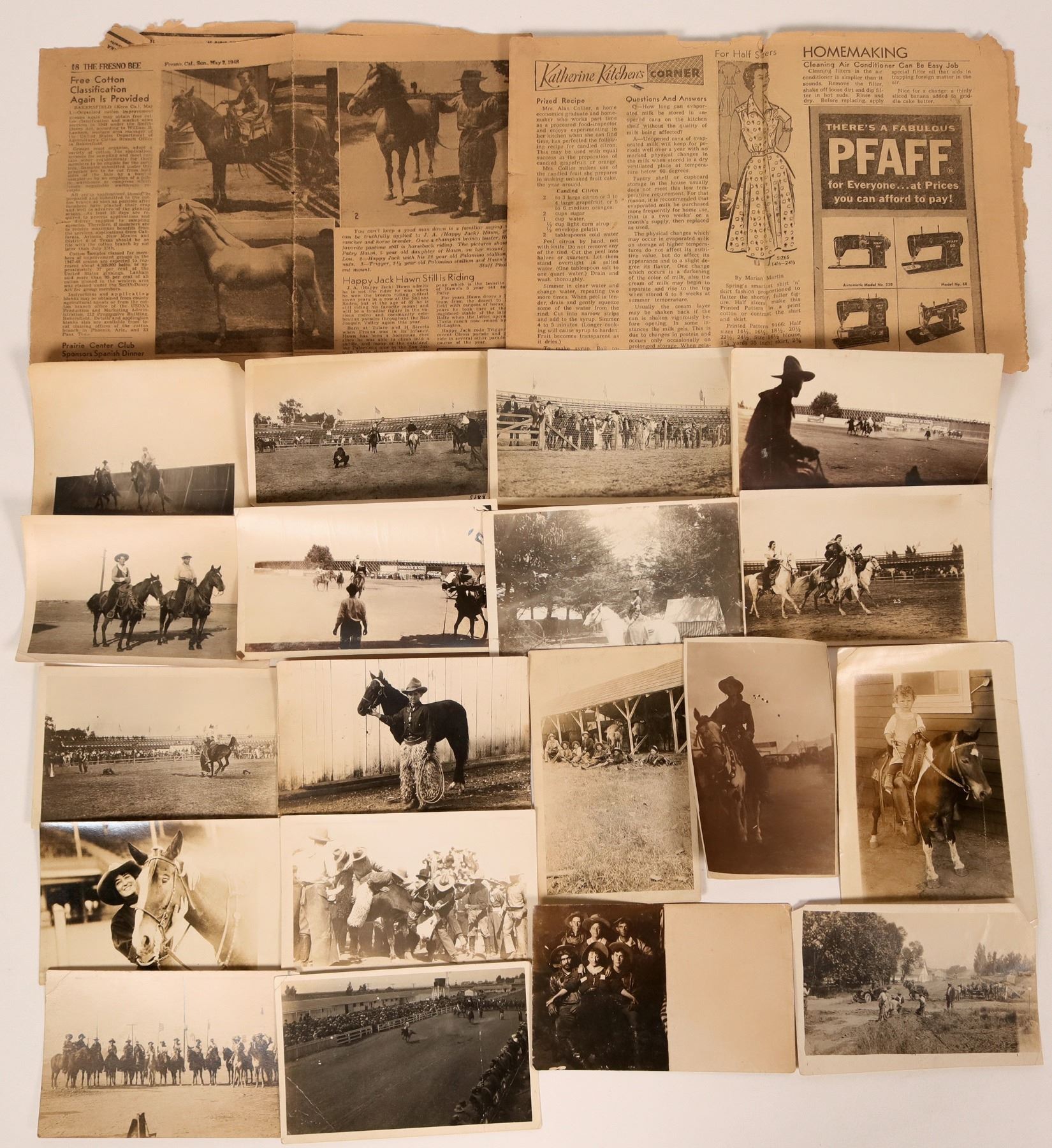 Lot of 20. Includes 10 RPPC of rodeo and cowboy scenes; 9 B&W photos of rodeo and cowboy scenes (approx. 3 x 5"); and two newspaper articles (1948 and 1958) about Happy Jack Hawn, "a native Fresnan and one of the San Joaquin Valley's best known horsemen." None of the postcards are labelled, but one is stamped Trout Studio, Salinas, Cal. A few of the photos are identified on the reverse as Fresno Fair Grounds.