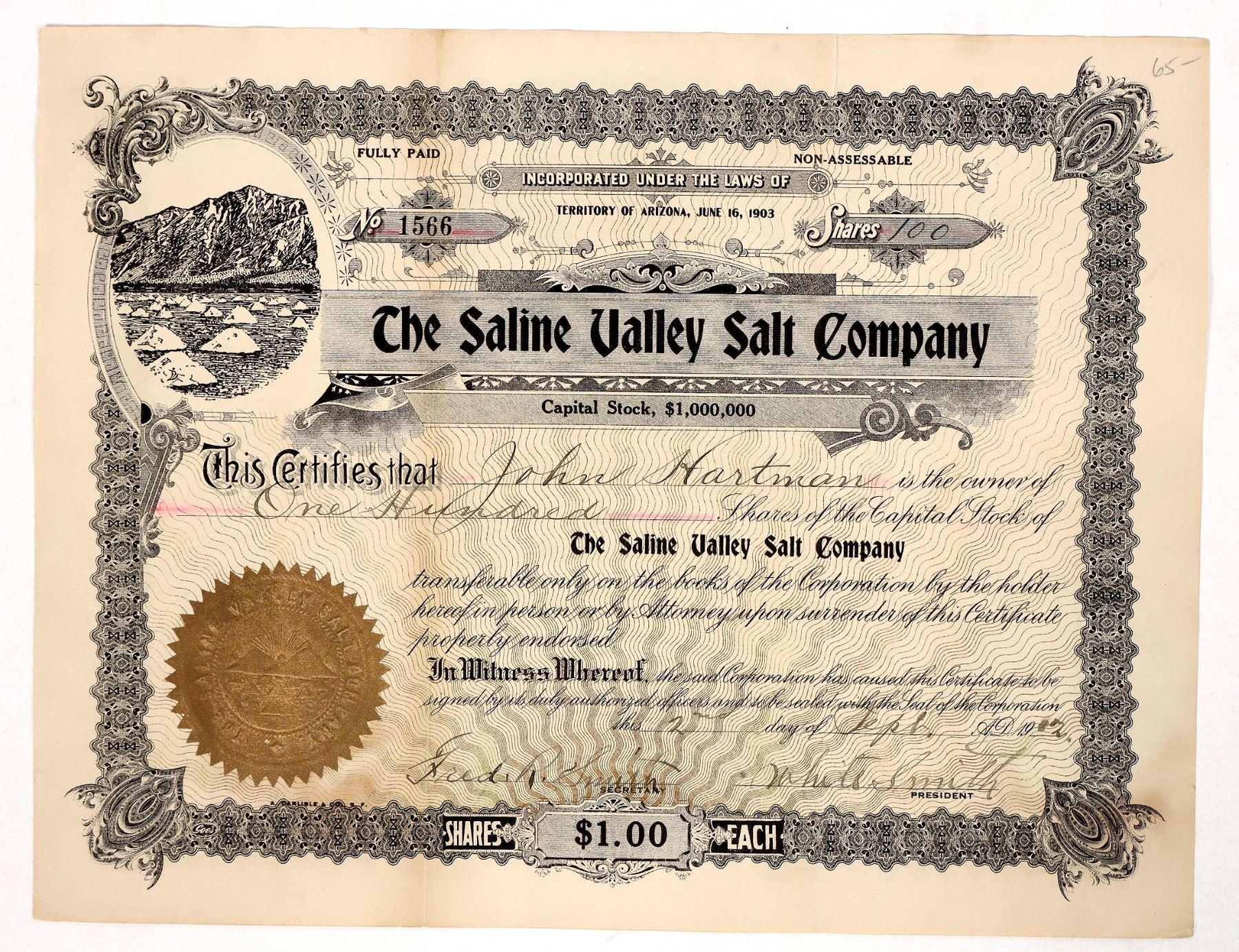 A stock certificate for 100 shares in the Saline Valley Salt Company, made out to John Hartman in 1904. No. 1566 issued. The Saline Valley Salt Company operated from the 1910s to the 1930s, mining and transporting the exceptionally pure natural salt found in the Saline Valley just northwest of Death Valley, until the costs of operating the tram that transported the salt proved too high. The certificate is signed by the secretary and president of the company with an embossed seal. It has an excellent vignette picturing salt piles on the valley floor. Generally good condition besides some toning.