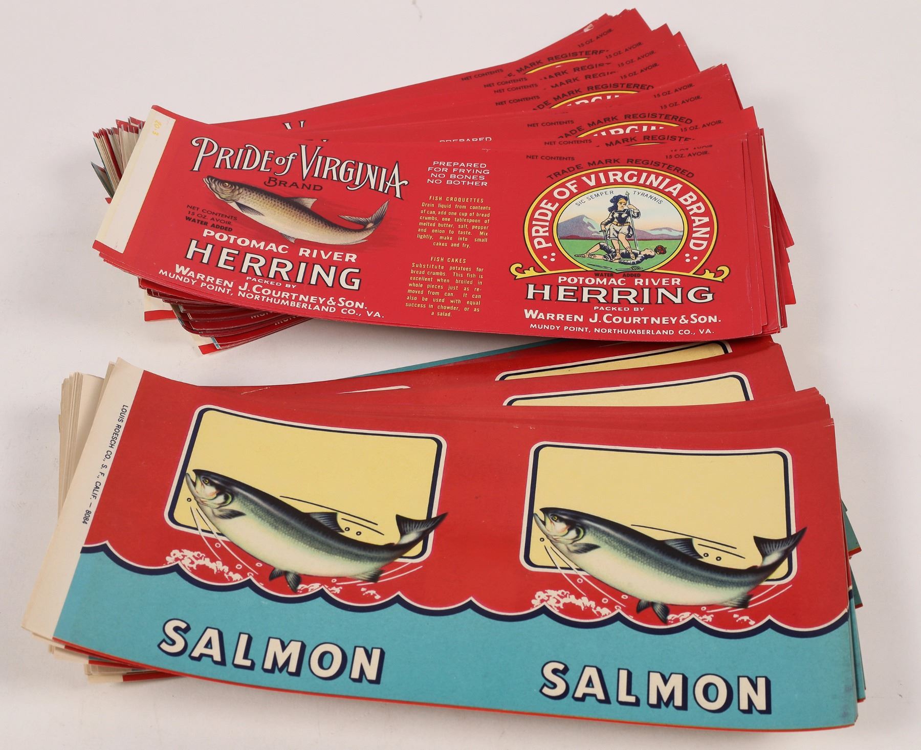 About 400 Salmon and Pride of Virginia Herring can labels. 4.5x10".
